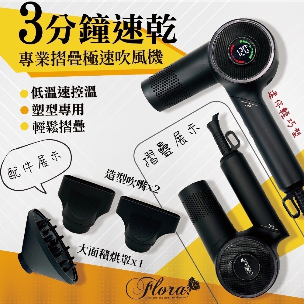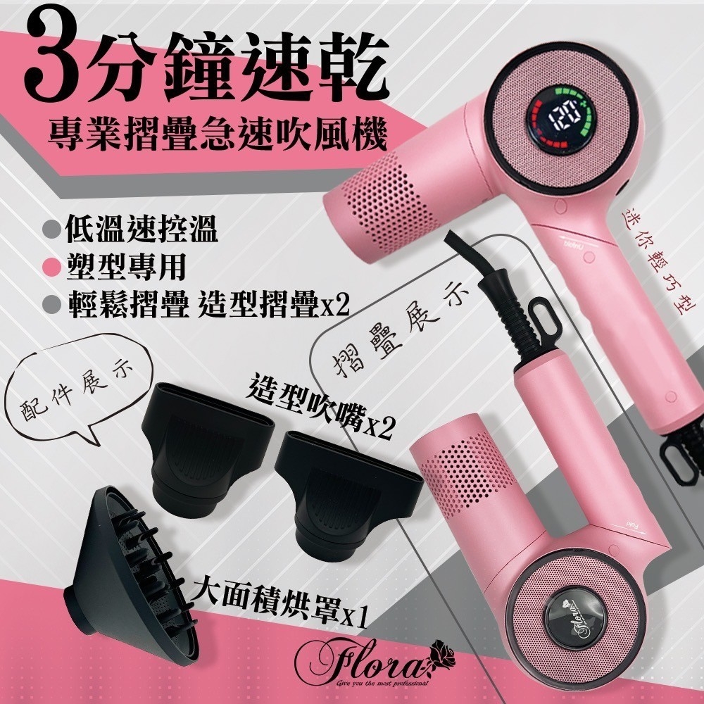 【Flora 芙若菈】送行動電源 FLORA 專業折疊極速吹風機 LD230 造型吹風機 磁吸吹嘴 倒吹清潔功能 風大高級吹風機 五段溫度選擇