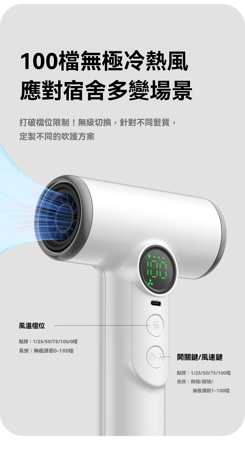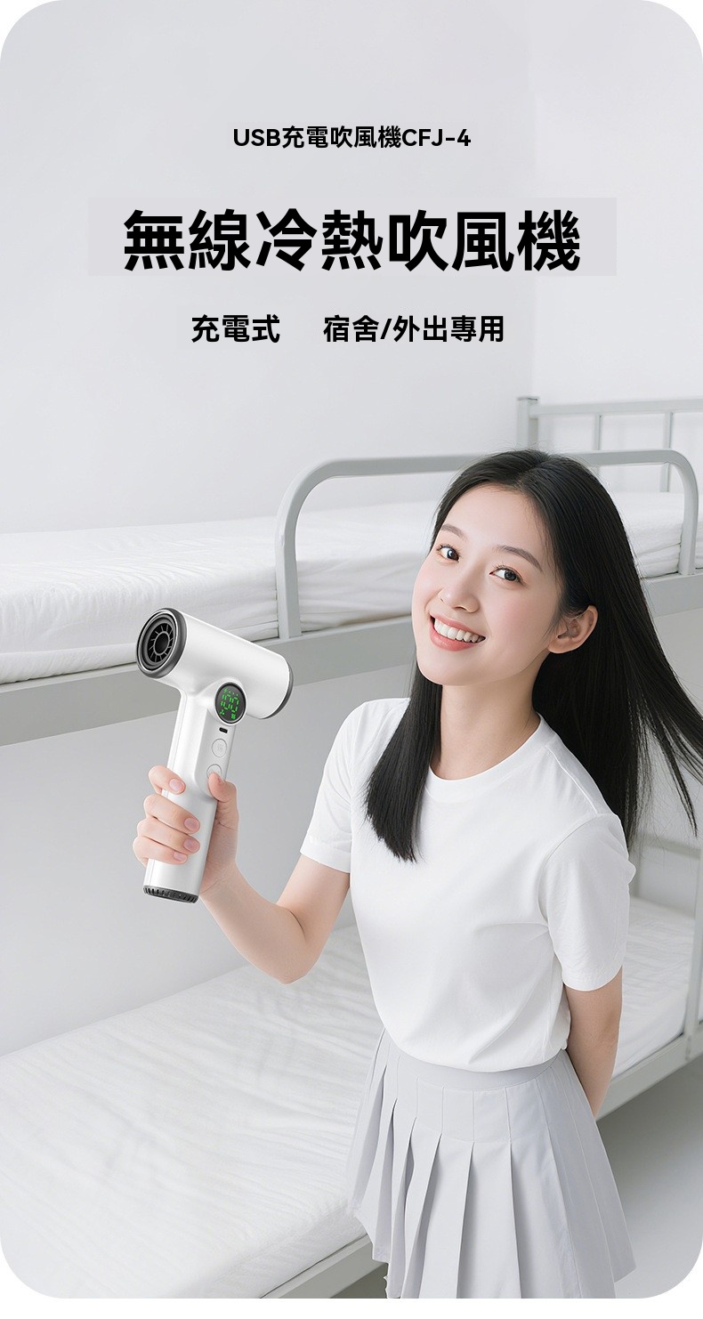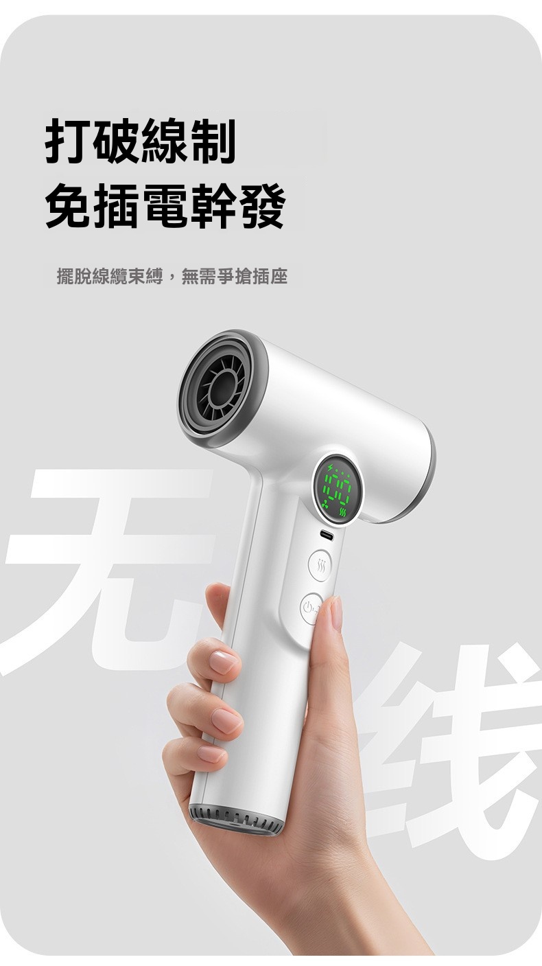 無線吹風機 USB充電式吹風筒 便攜式不插電學生宿舍用大風力吹熱風(無極冷熱風/長續航/智慧控溫)