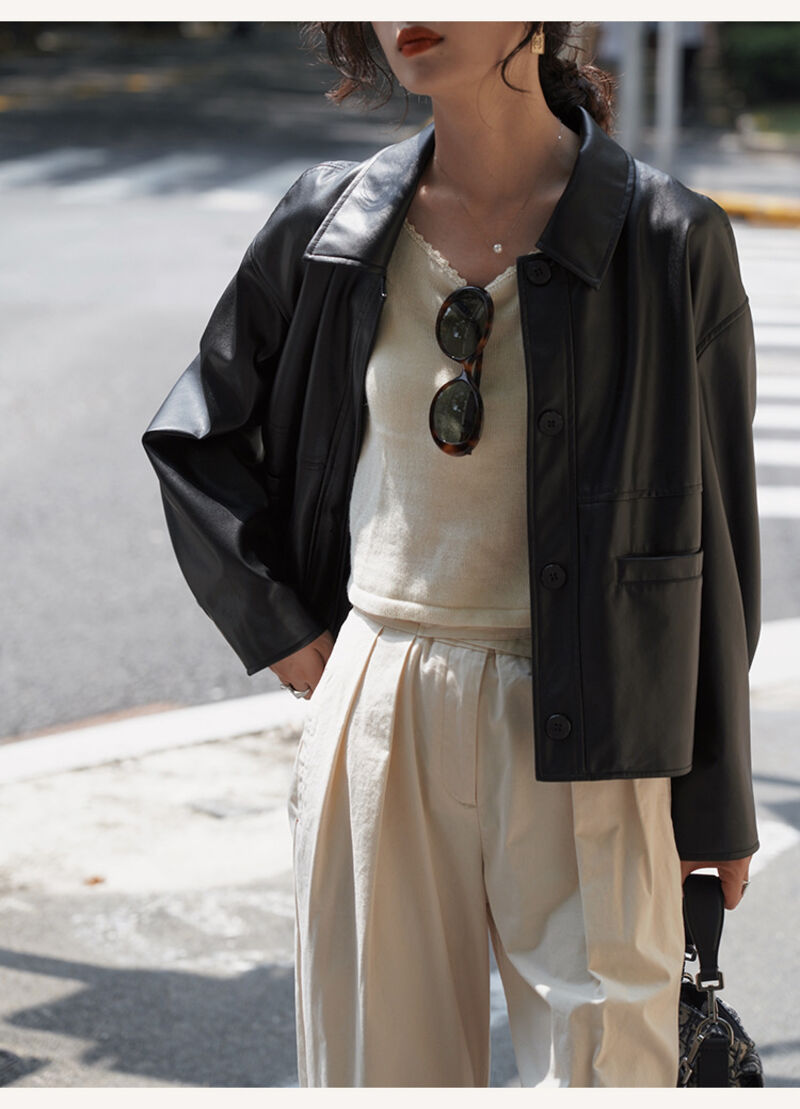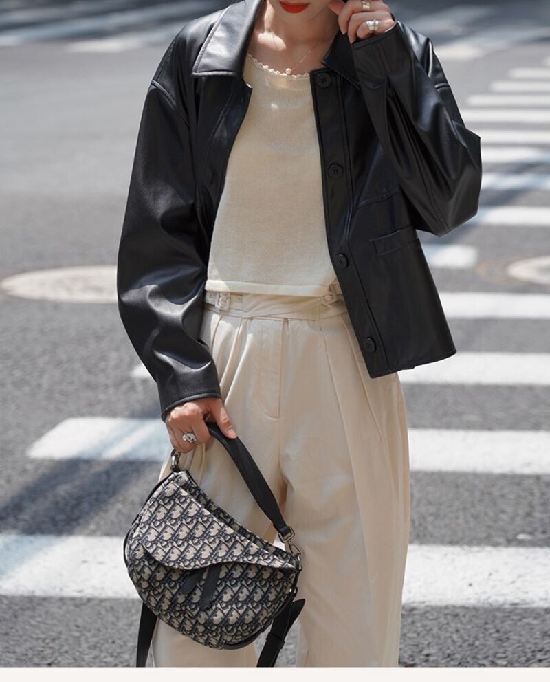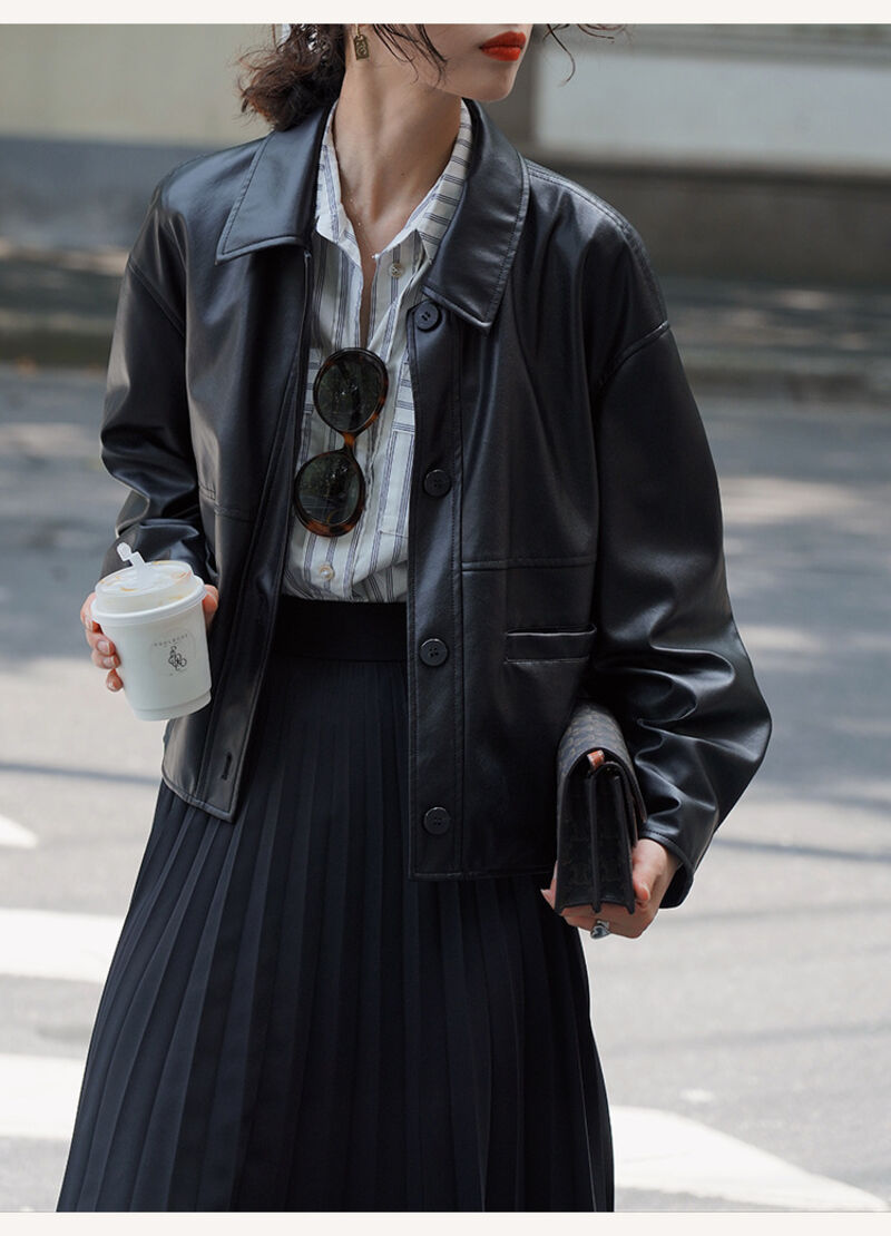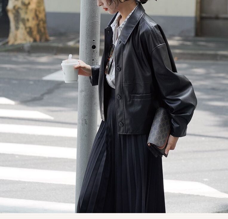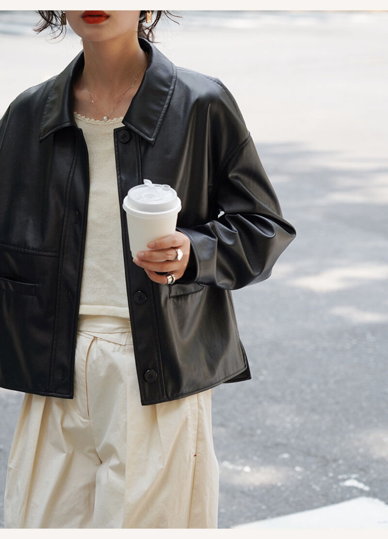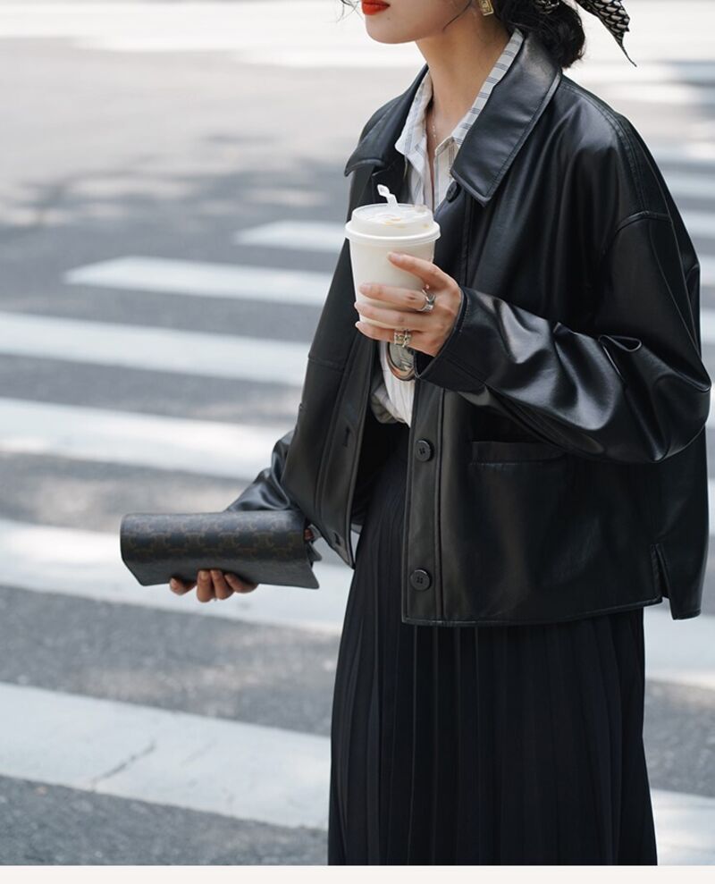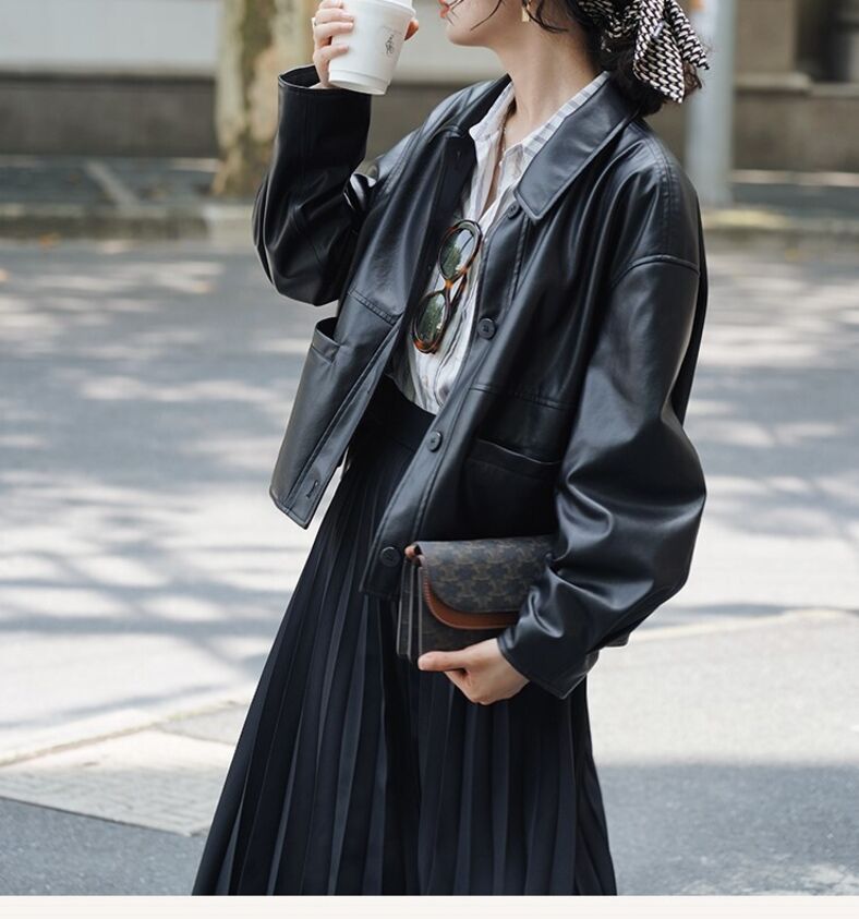 法式黑色皮衣女寬松短款小個子皮夾克外套女 翻領皮夾克外套大衣 純色寬鬆外套上衣開衫 法式通勤氣質優雅風外搭 七夕生日禮物