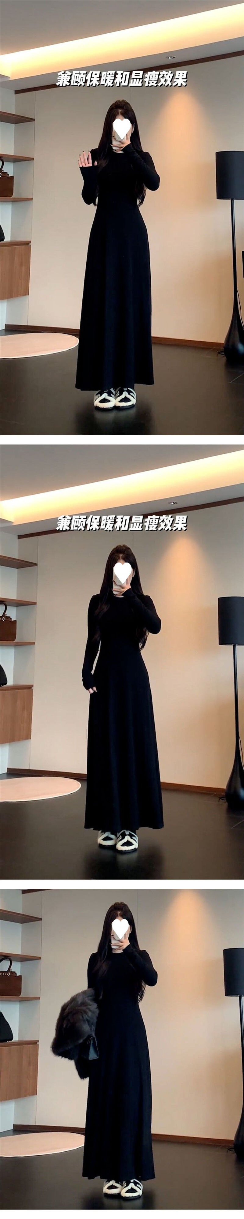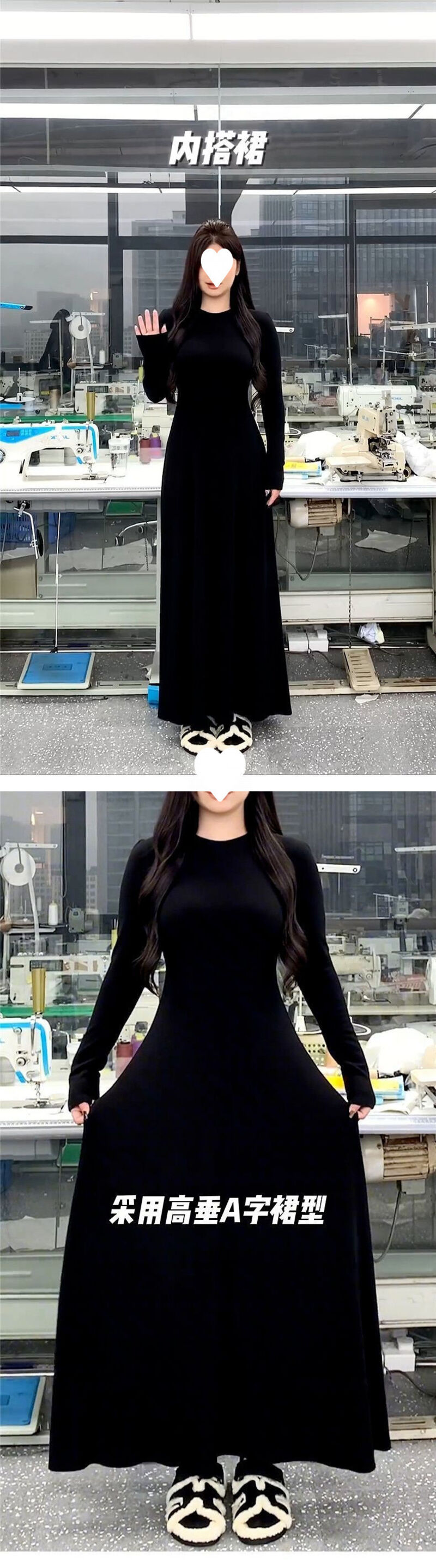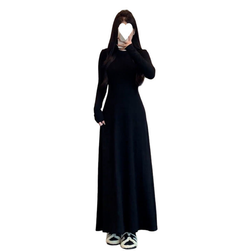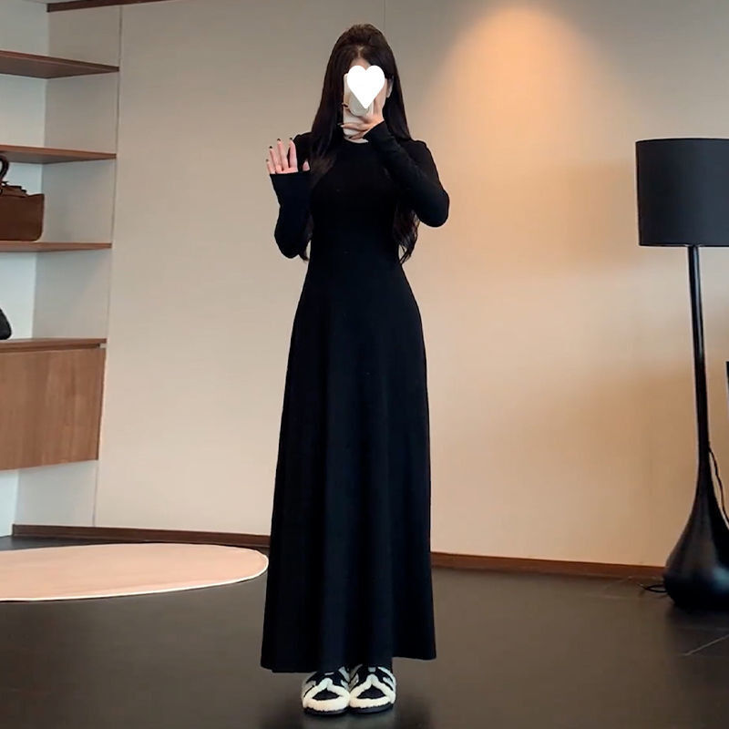 連衣裙女長裙洋裝裙子法式長袖圓領黑色連衣裙子女春秋季2025新款A字裙氣質內搭打底長裙約會生日氣質高級感收腰長款裙子女