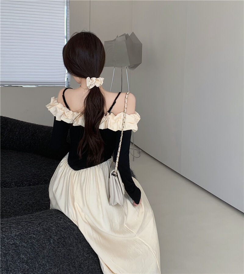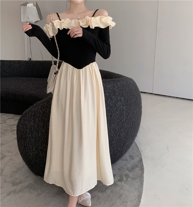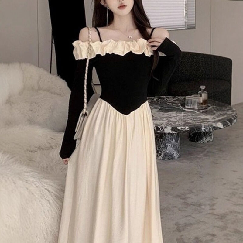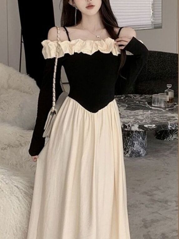 連衣裙女長裙吊帶裙女赫本風一字領拼接撞色吊帶連衣裙女2025春秋季新款法式修身收腰氣質長裙洋裝裙子生日小禮服約會氣質長裙