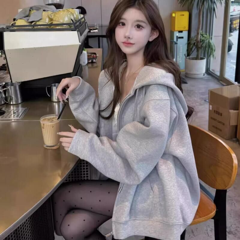 灰色連帽外套衛衣外套女春秋季薄款韓系慵懶美式寬松連帽拉鏈開衫上衣寬鬆連帽夾克外套運動休閒風學生日韓舒適休閒風氣質通勤外套