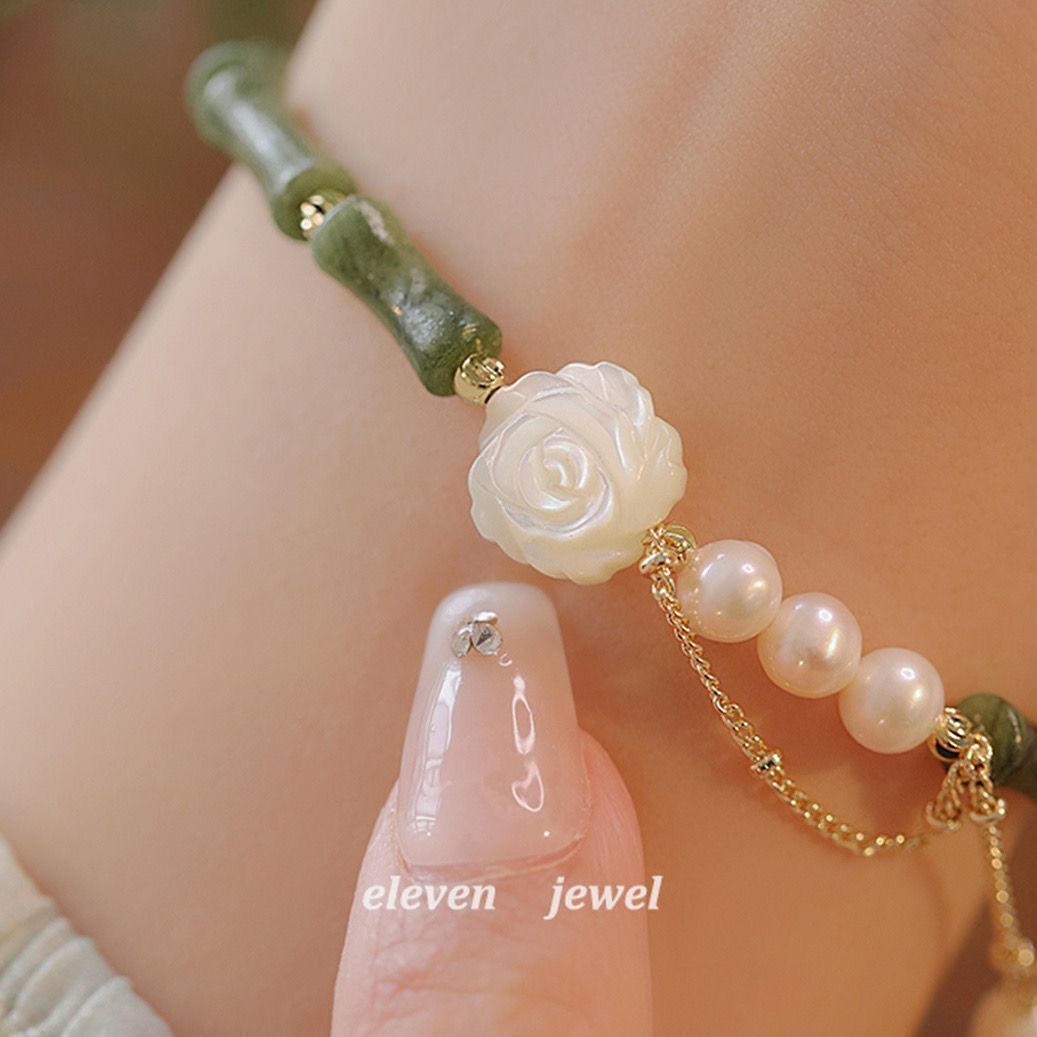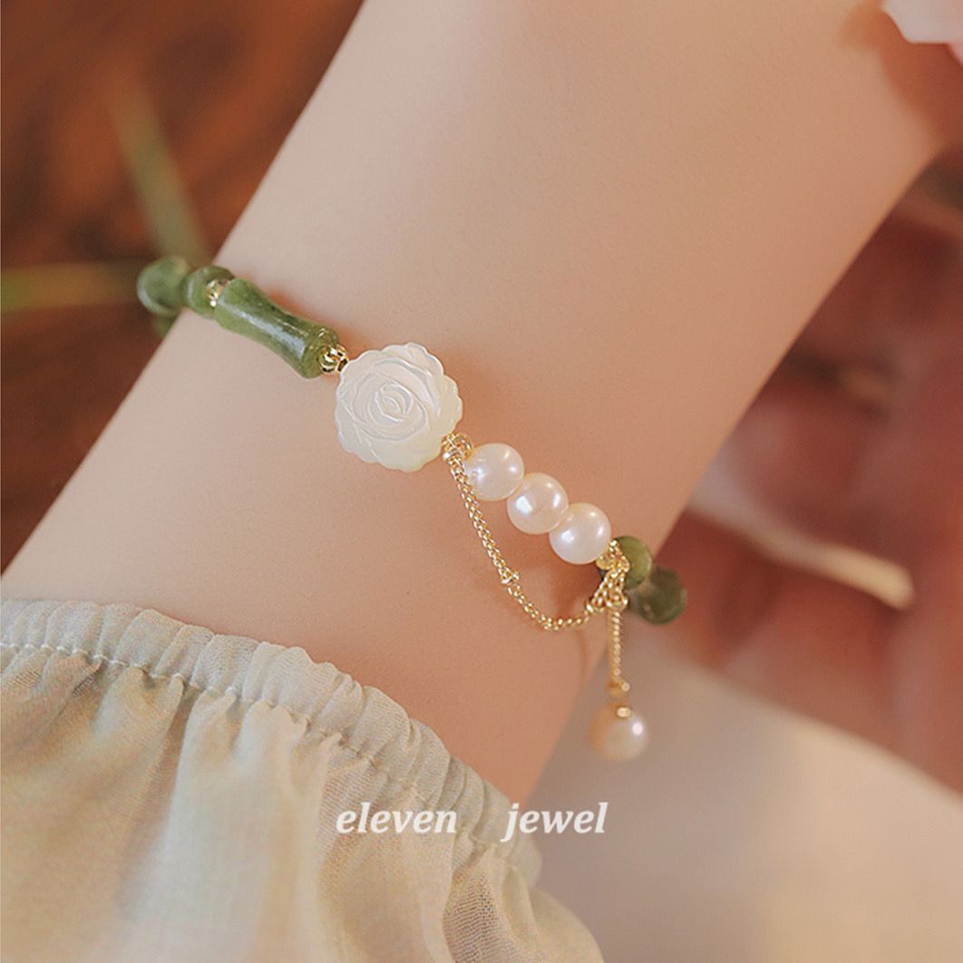 手鍊玫瑰與你新中式橄榄綠竹節手鏈女珍珠流蘇氣質高顏值手飾手鏈時尚百搭手鏈手環手鐲可調整大小精緻甜美手鍊情侶手繩送禮禮物