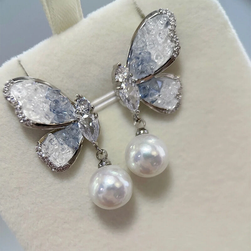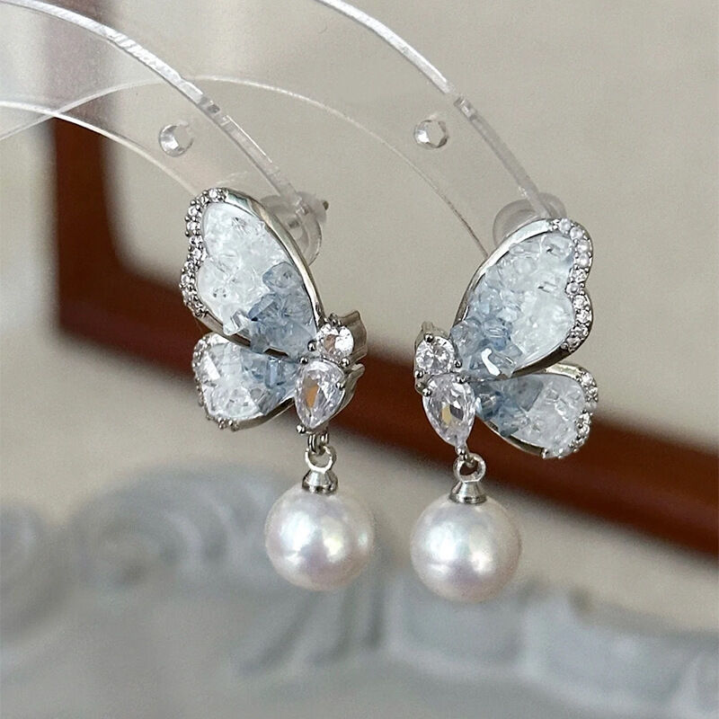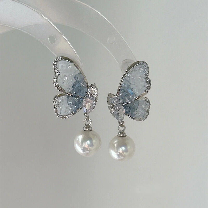 耳環翩翩起舞~藍色水晶蝴蝶珍珠耳環小眾設計感高級感耳釘耳飾女 耳環耳釘耳飾女生耳環法式耳環流行百搭耳釘生日禮物貼耳耳環