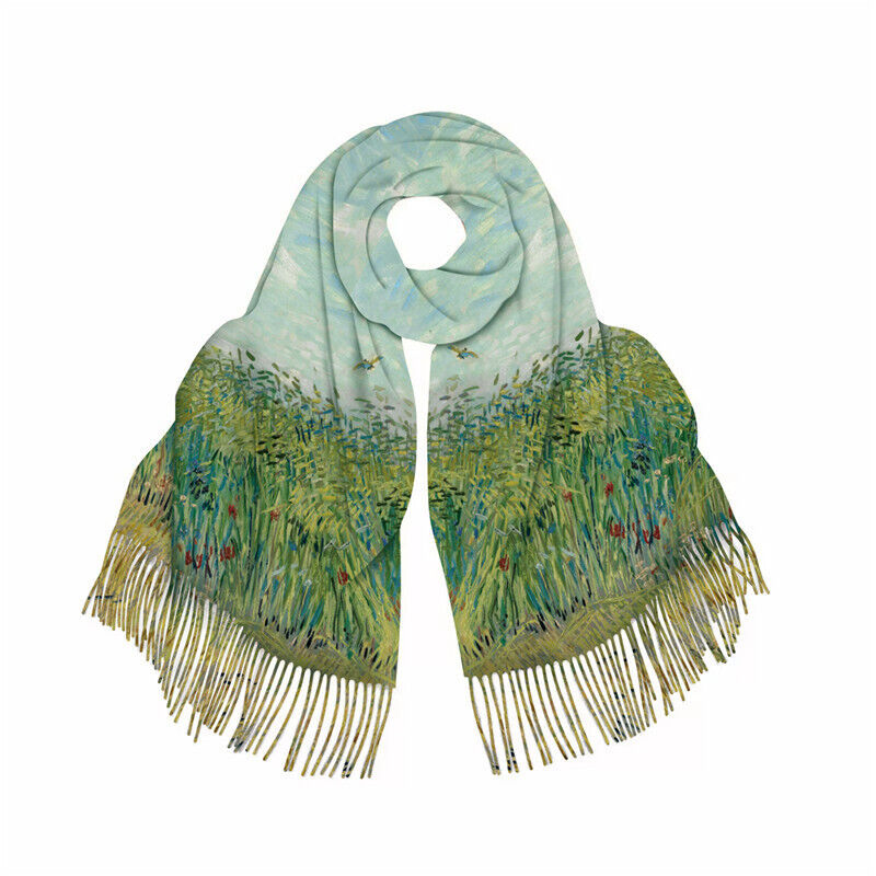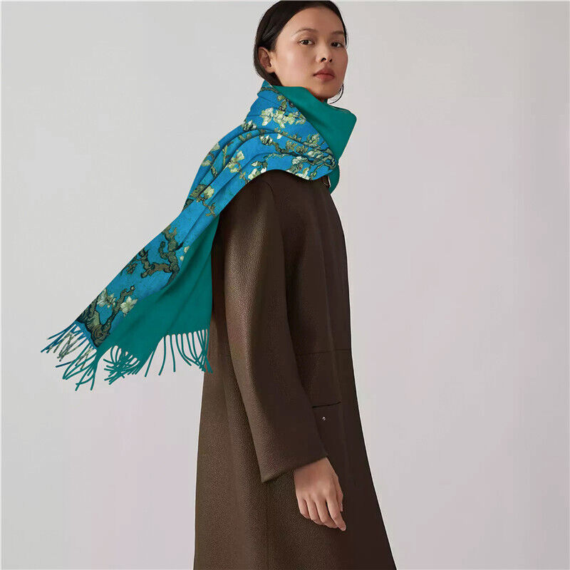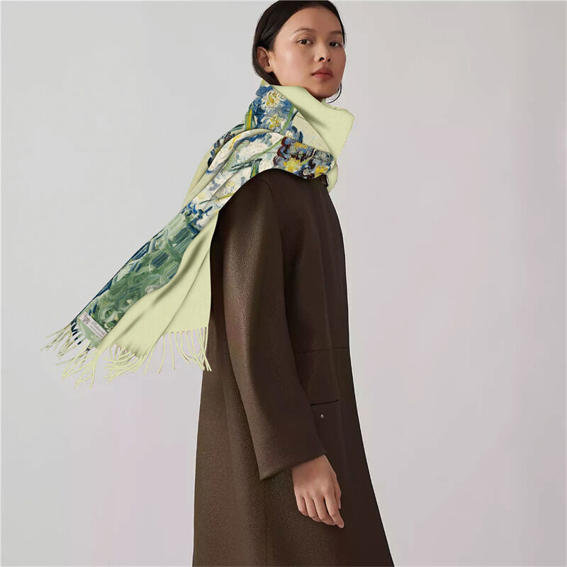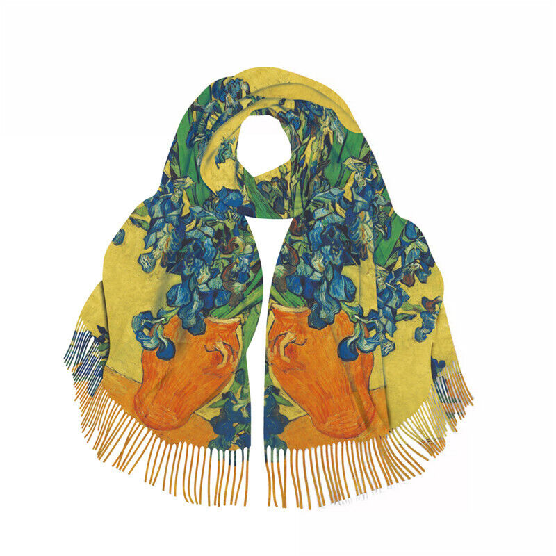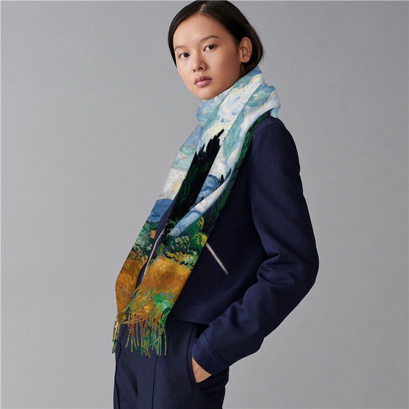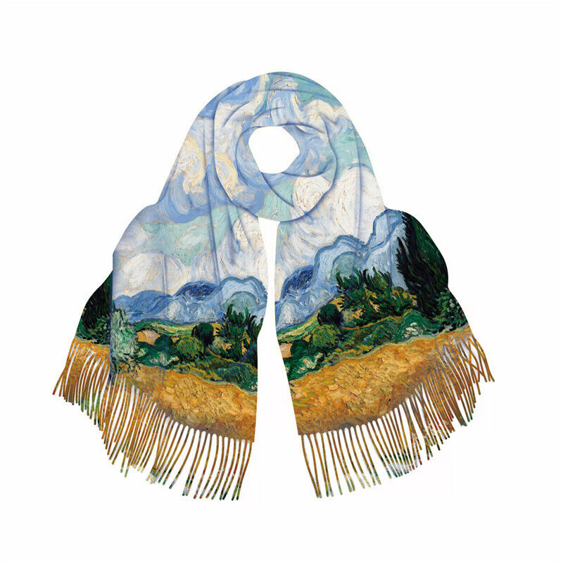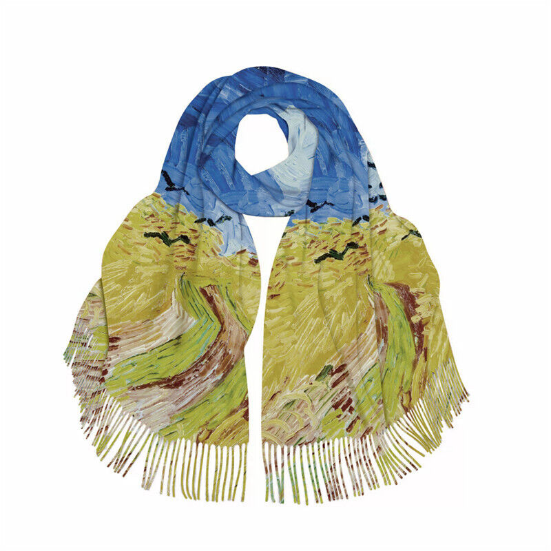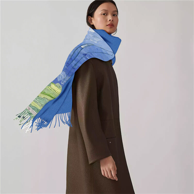 圍巾女秋冬季仿羊絨圍巾梵高油畫雙面印花圍脖冬季保暖流蘇披肩保暖披肩圍巾質感圍巾冷氣披肩空調百搭保暖圍脖防風圍脖韓版圍巾