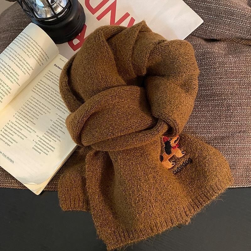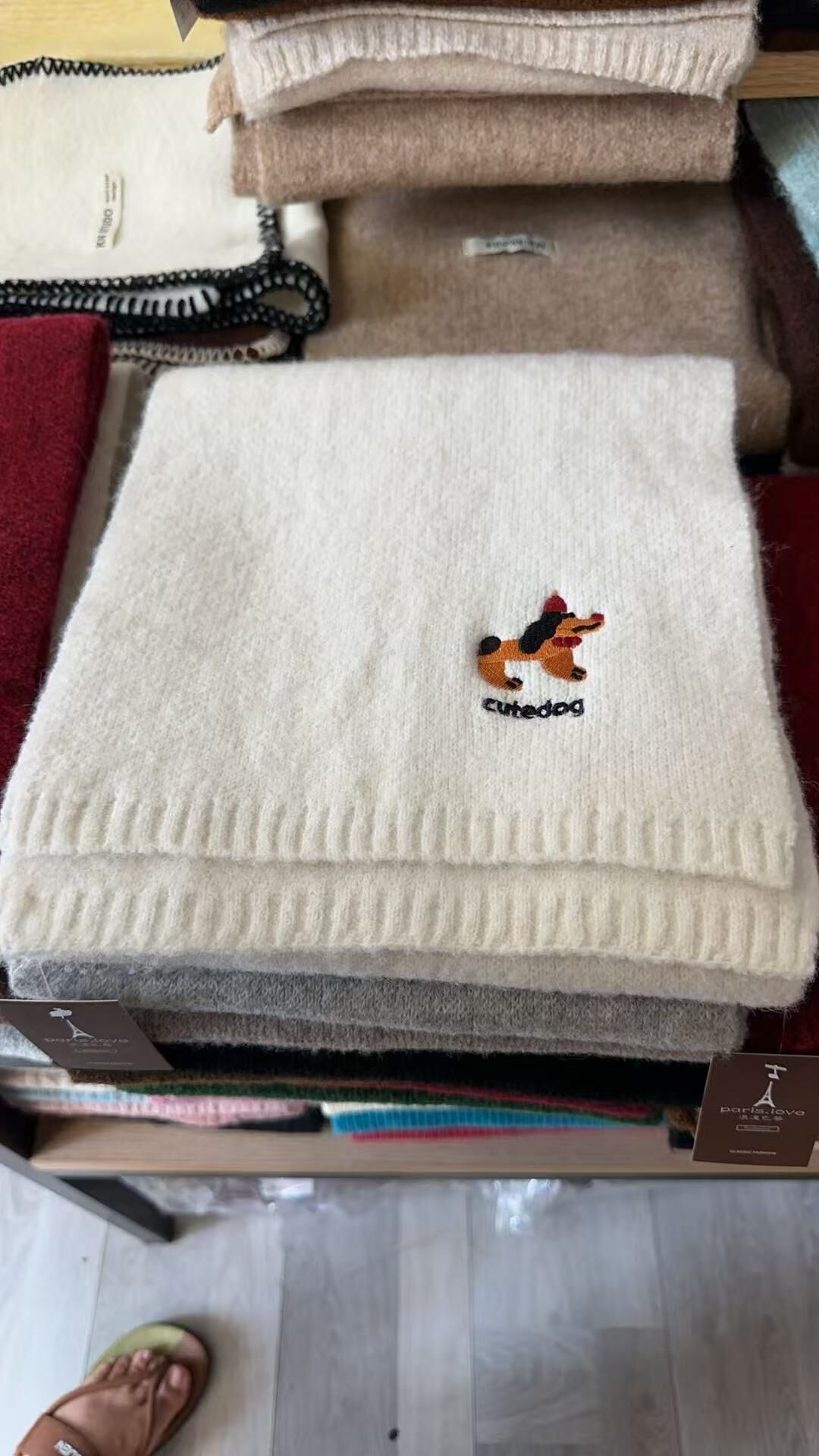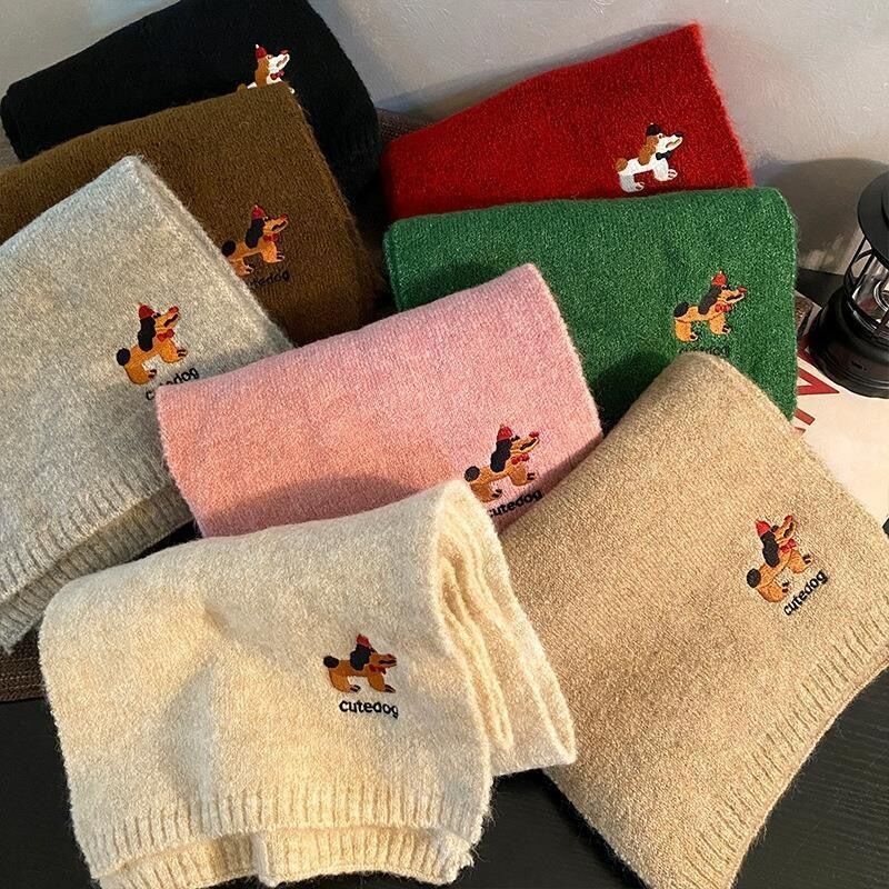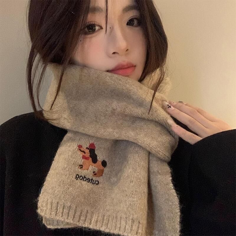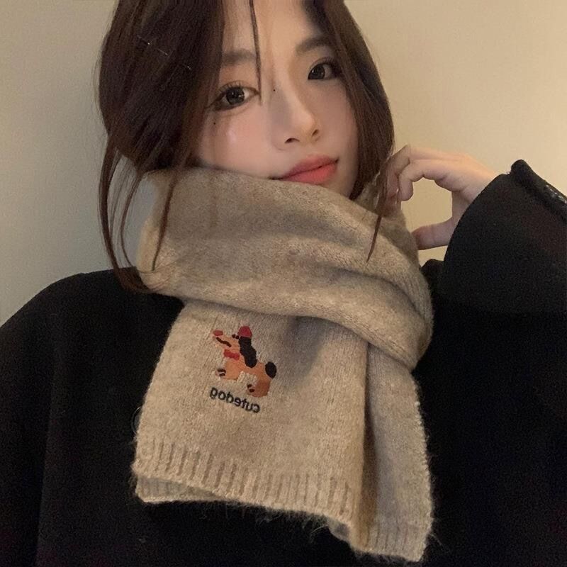 圍巾女韓系可愛小狗刺繡圍巾女冬季時尚毛混紡披肩加厚保暖防寒針織圍脖保暖披肩圍巾質感圍巾冷氣披肩保暖圍脖防風圍脖韓版圍巾