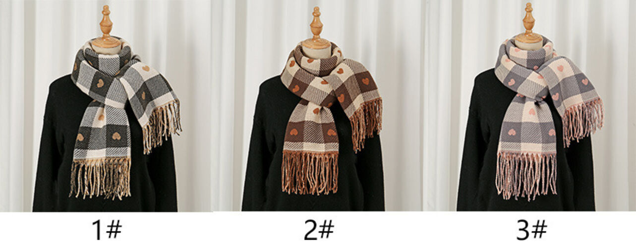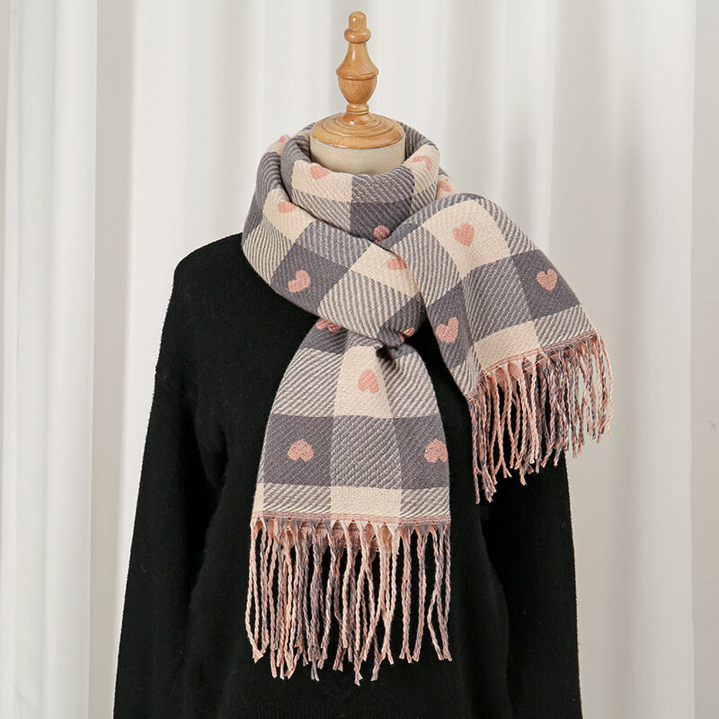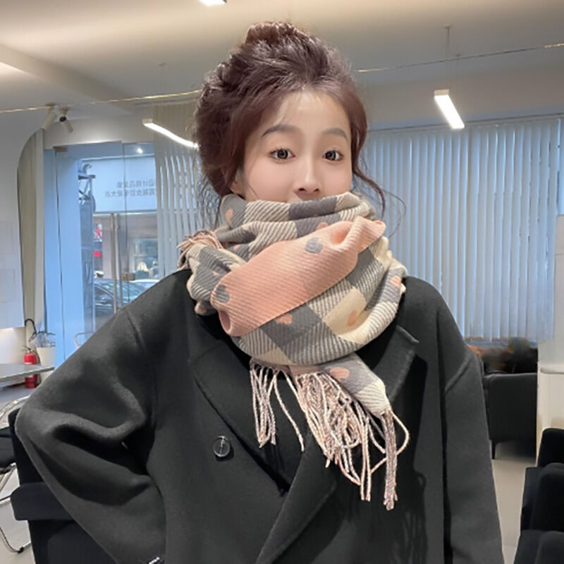 圍巾女保暖圍巾女款秋冬款雙面愛心格子流蘇披肩保暖百搭圍脖仿羊絨圍巾披肩圍巾質感圍巾冷氣披肩百搭保暖圍脖防風圍脖韓版圍巾