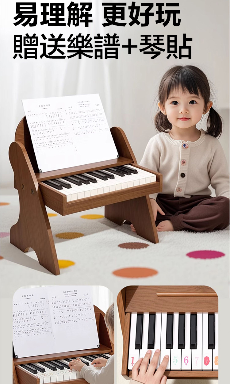 送了超實用的樂譜和琴貼! 琴貼貼在琴鍵上,寶寶看顏色/圖案就能彈簡單的曲子,超有成就感!樂譜也是專門為小朋友設計的,簡單易懂,好玩不枯燥!再也不用擔心寶寶玩兩下就膩了!激發興趣妥妥的~