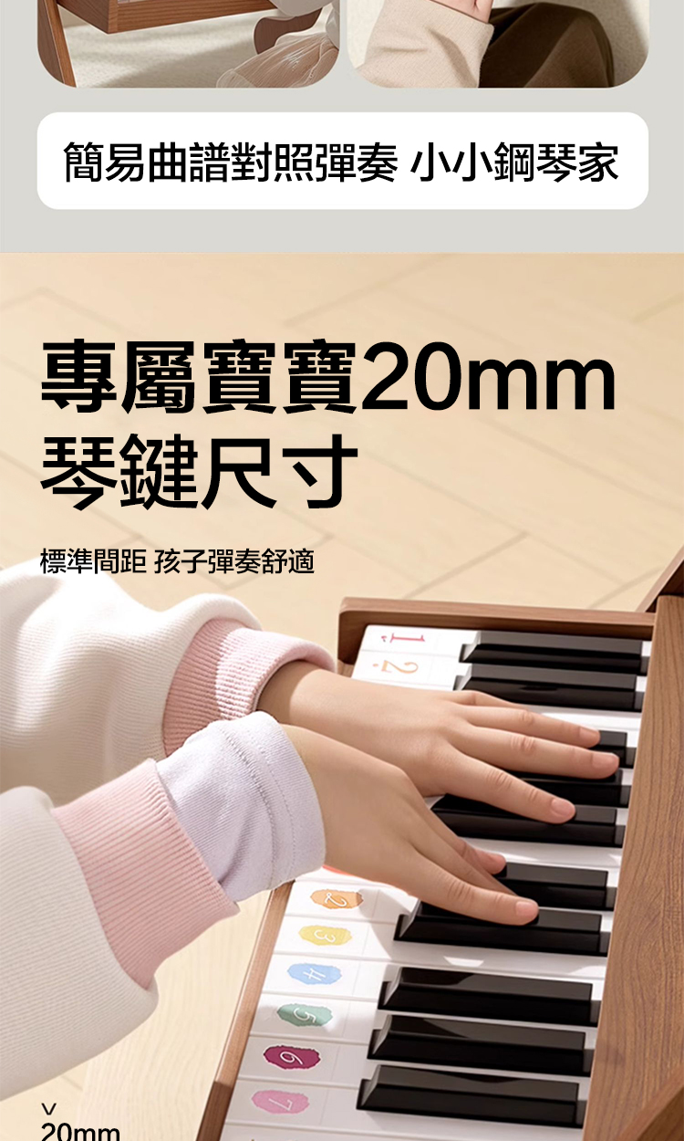 20mm標準琴鍵間距! 這個太重要了!和真鋼琴壹樣的比例,寶寶的小手指按上去剛剛好,舒服又標準!從小養成正確指法習慣,以後學真鋼琴無縫銜接~ 琴鍵觸感也很靈敏,音質超級清晰悅耳,不是那種劣質的電子音!這才是真正的音樂啟蒙啊!🎶