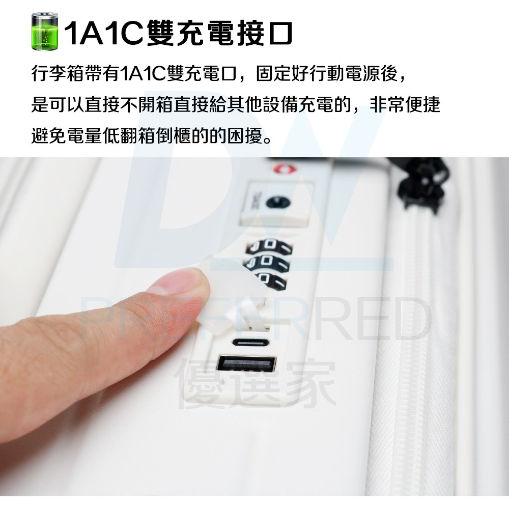 注意:行李箱本體不帶電,是帶的充電口,完全不會影響托運喔~只需要內置好行動電源,即可隨時隨地不開箱的情況下給其他設備充電喔~~