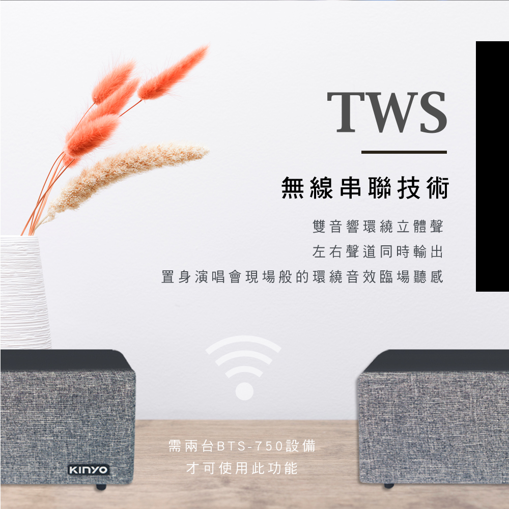 TWS無線串聯技術,左右聲道同時輸出,給您如置身演唱會現場般的真實環繞音效臨場聽感。(需兩台BTS-750設備才可使用此功能)
