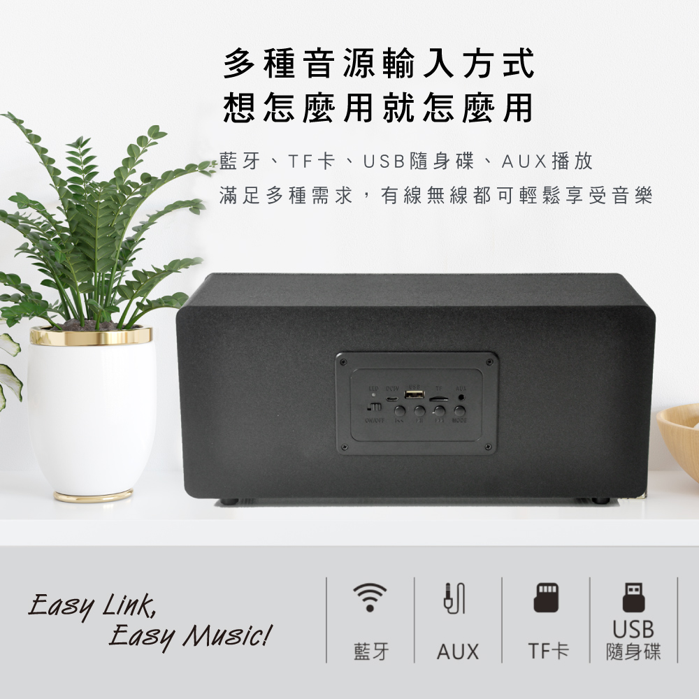 具USB隨身碟、TF卡槽,插入可直接撥放音樂。