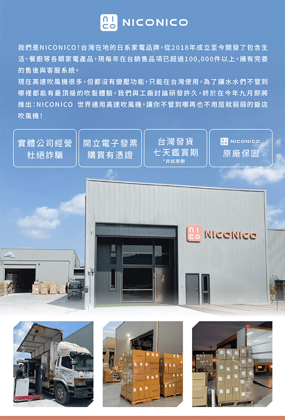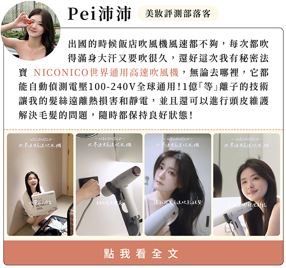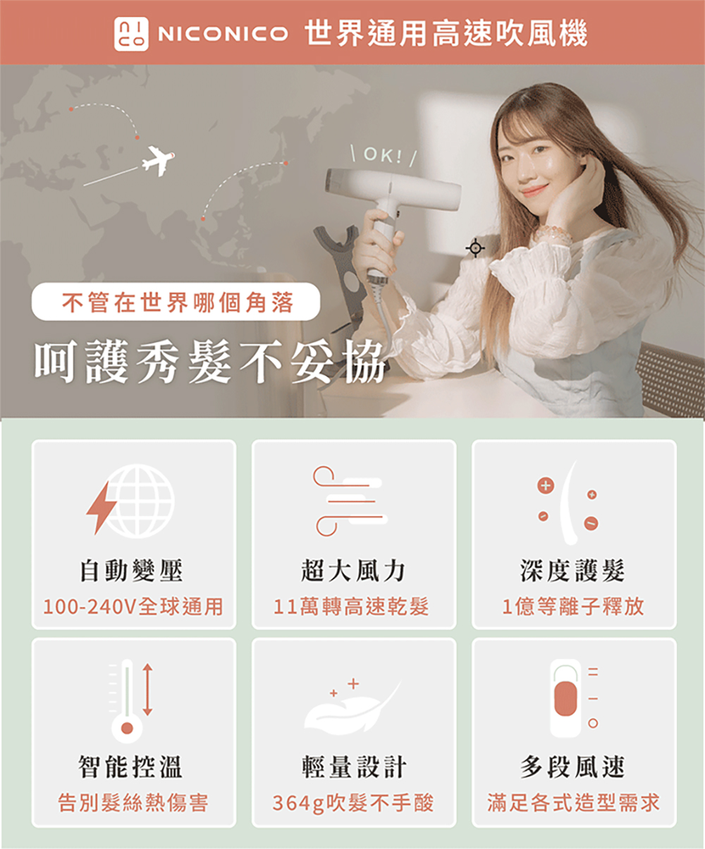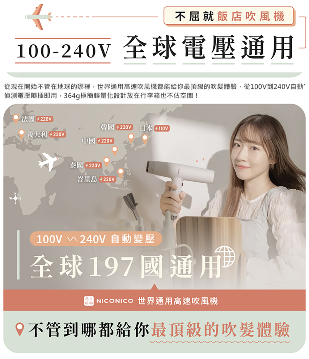 NICONICO 世界通用高速吹風機,搭載自動電壓設計,100~240V 全球通用,出國攜帶最安心。