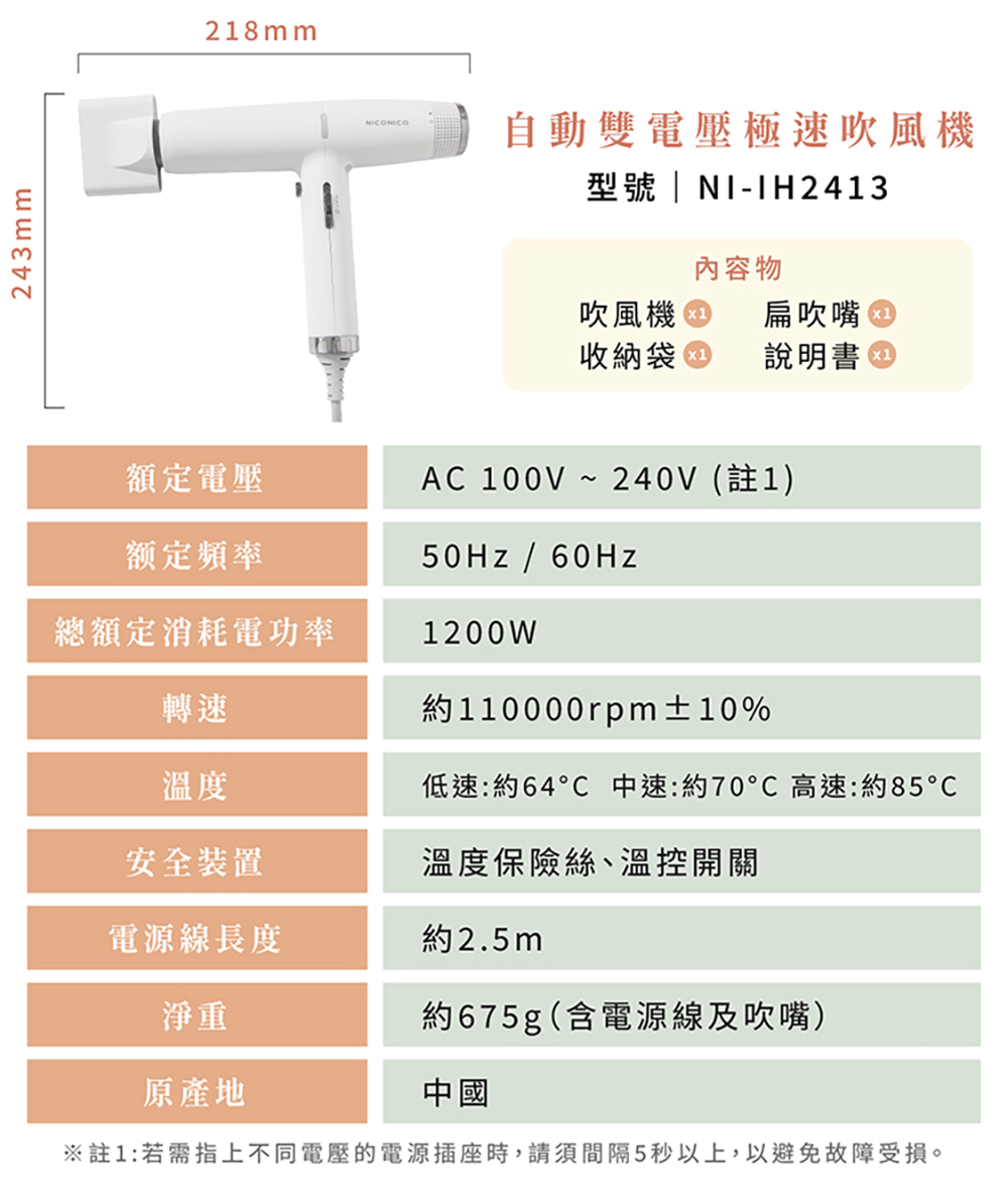 NICONICO , NICONICO吹風機 , NI-IH2413 , NIIH2413 , NI2413 , BLDC吹風機 , 國際電壓吹風機 , 雙電壓吹風機 , 旅行吹風機 , 萬國吹風機 , 旅用吹風機 , 出國吹風機 , 攜帶吹風機 , 輕量吹風機