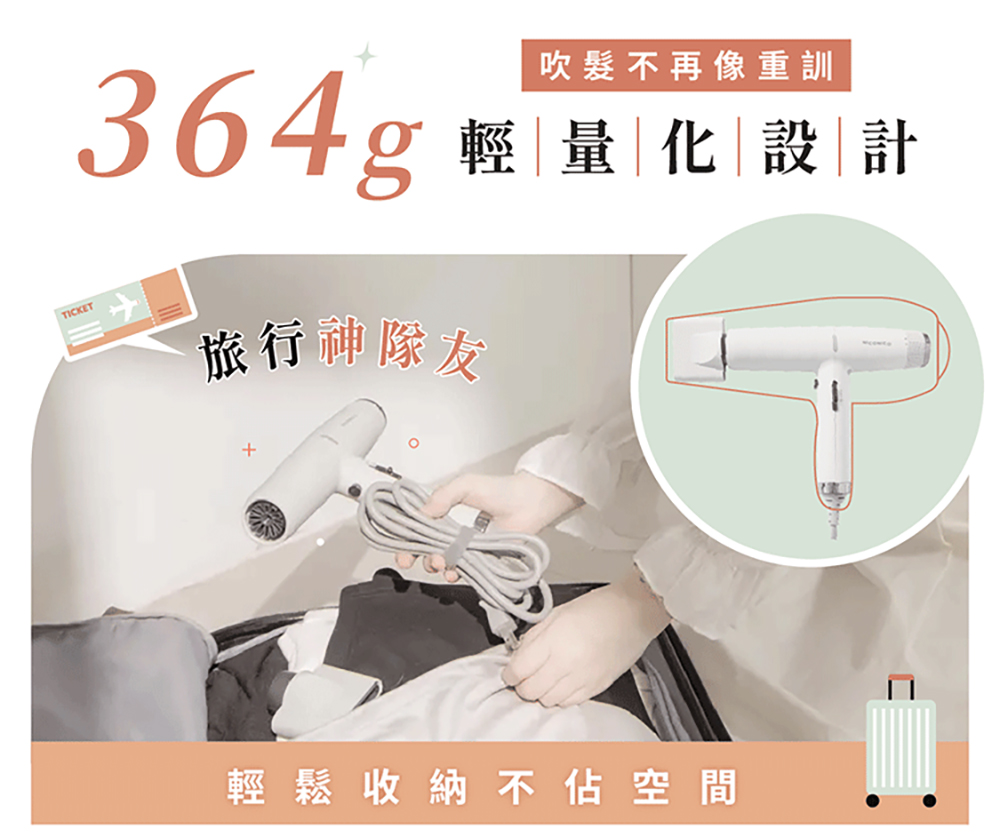 旅行吹風機輕量化設計僅 364g,方便收納不佔空間,內建 BLDC 直流無刷馬達,智能恆溫護髮,避免高溫損傷。