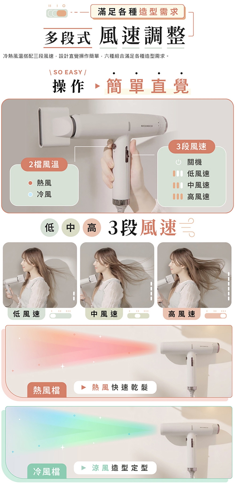 A3:內建 高速馬達 + 大風量設計,2 段風速、2 段溫度設定,可依需求選擇柔和護理或快速乾髮,滿足不同髮質需求。