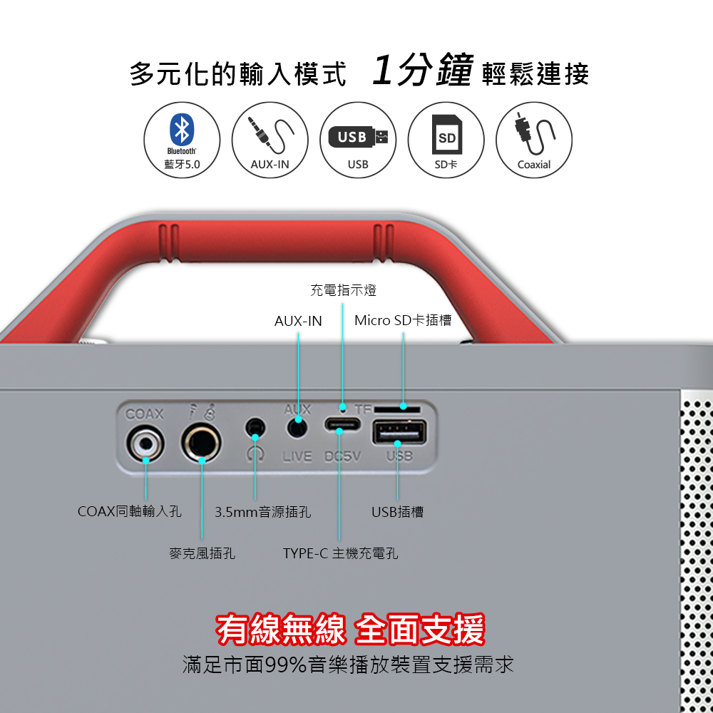 音源輸入:藍牙/AUX-IN/USB/SD卡/Coaxial