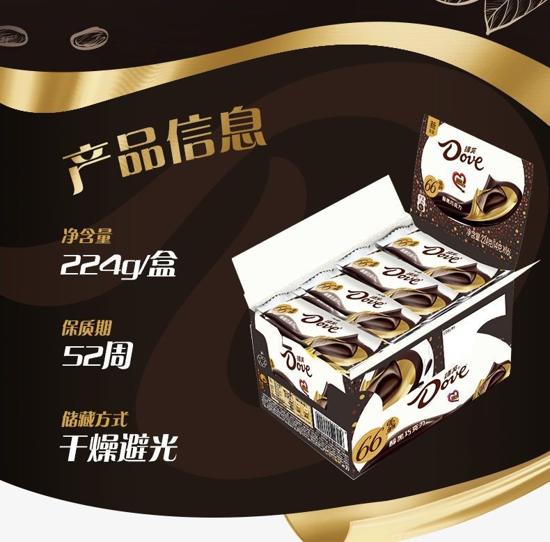 心心相印 德芙醇黑巧克力排塊224g盒裝66%純可可脂黑巧兒童休閒小零食囤貨