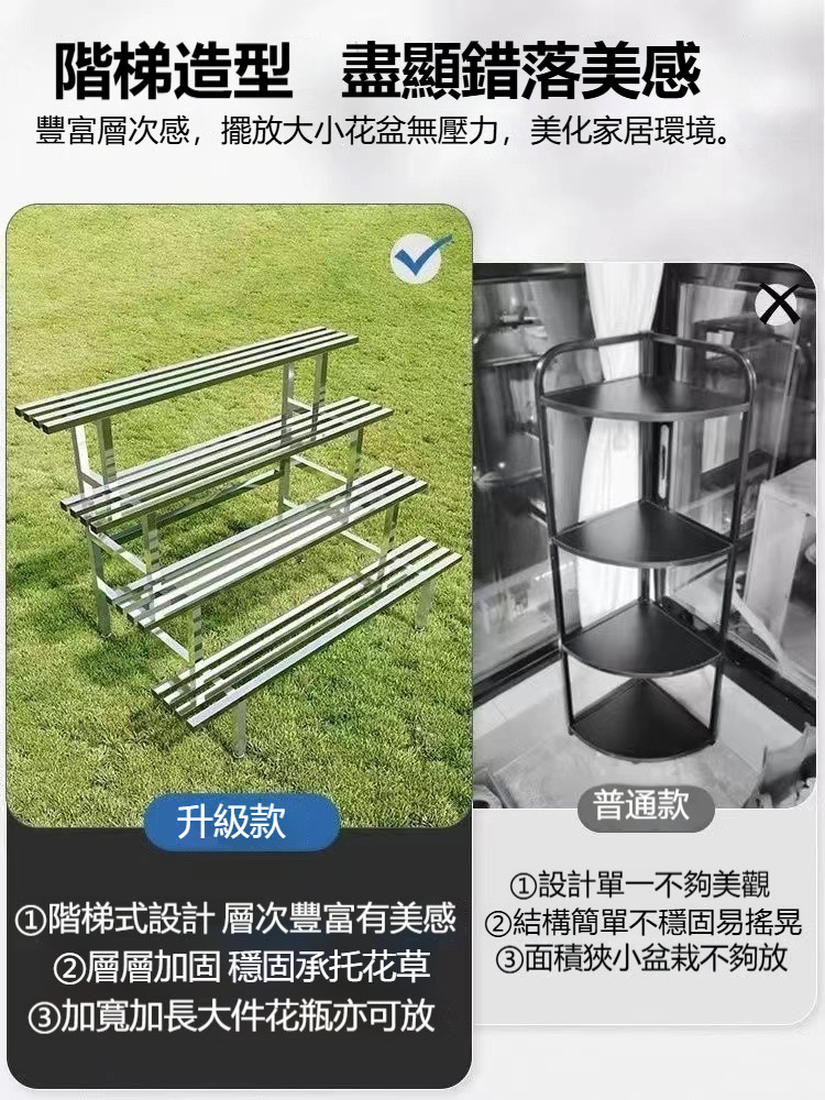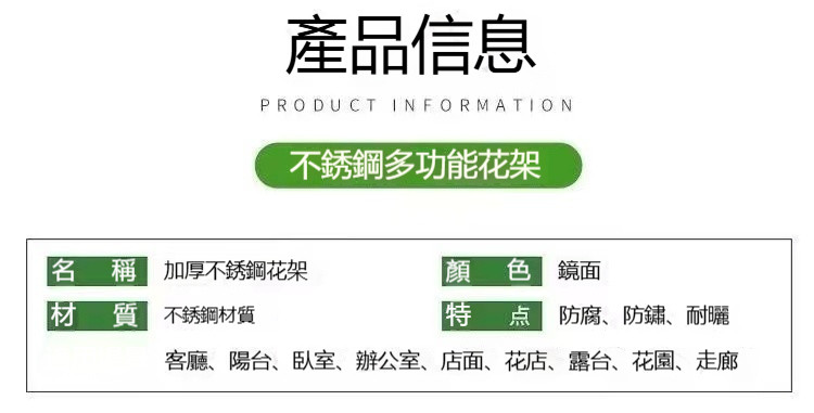 產品特點: 優質不鏽鋼材質,不生鏽不怕雨水 多功能放置各種物品 適合各類場所不違和 分層收納位置,打造更多位置 大件運輸無法避免輕微剮蹭跟磕碰