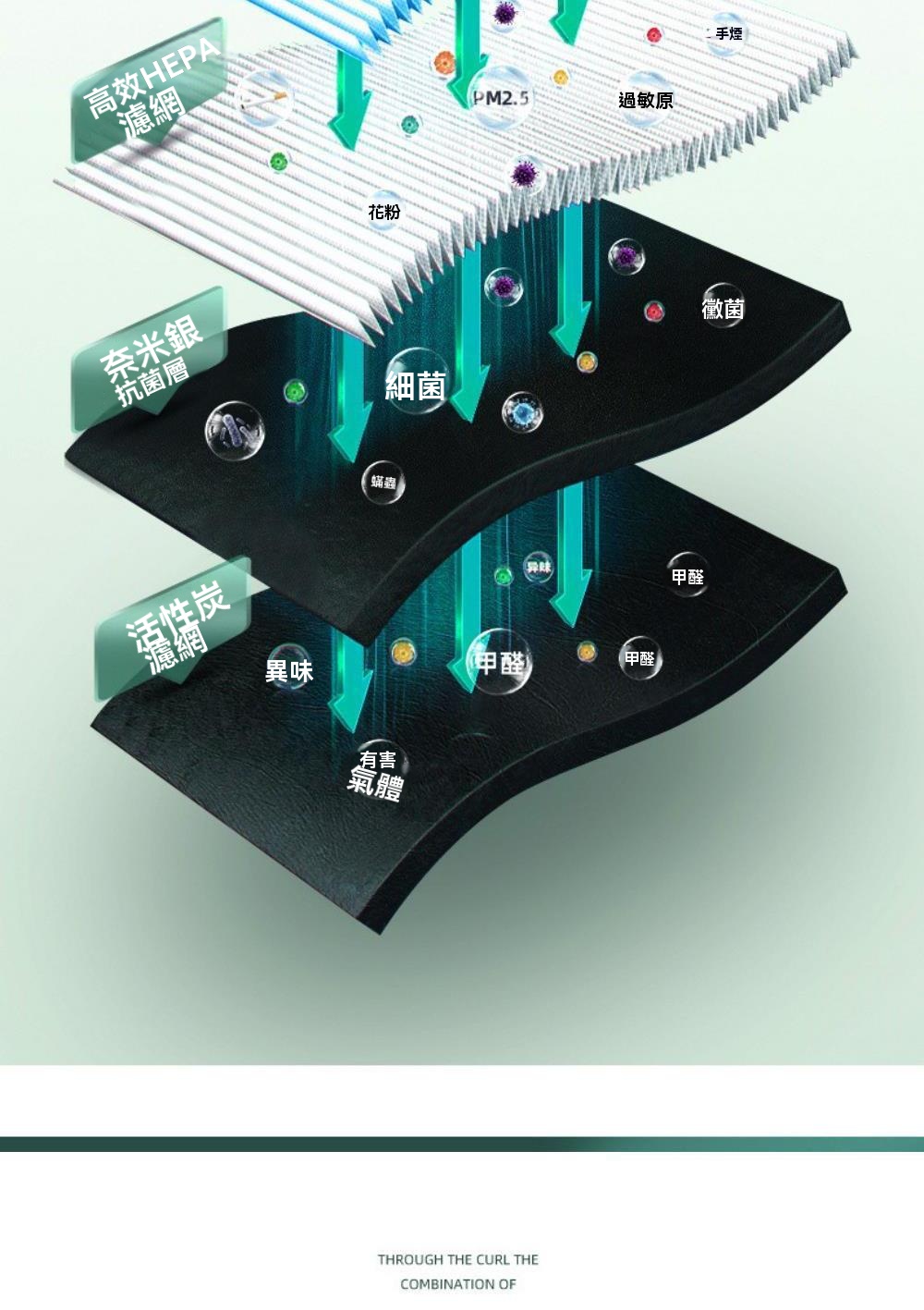初效濾網+HEPA濾網+納米銀抗菌層+活性炭濾網
