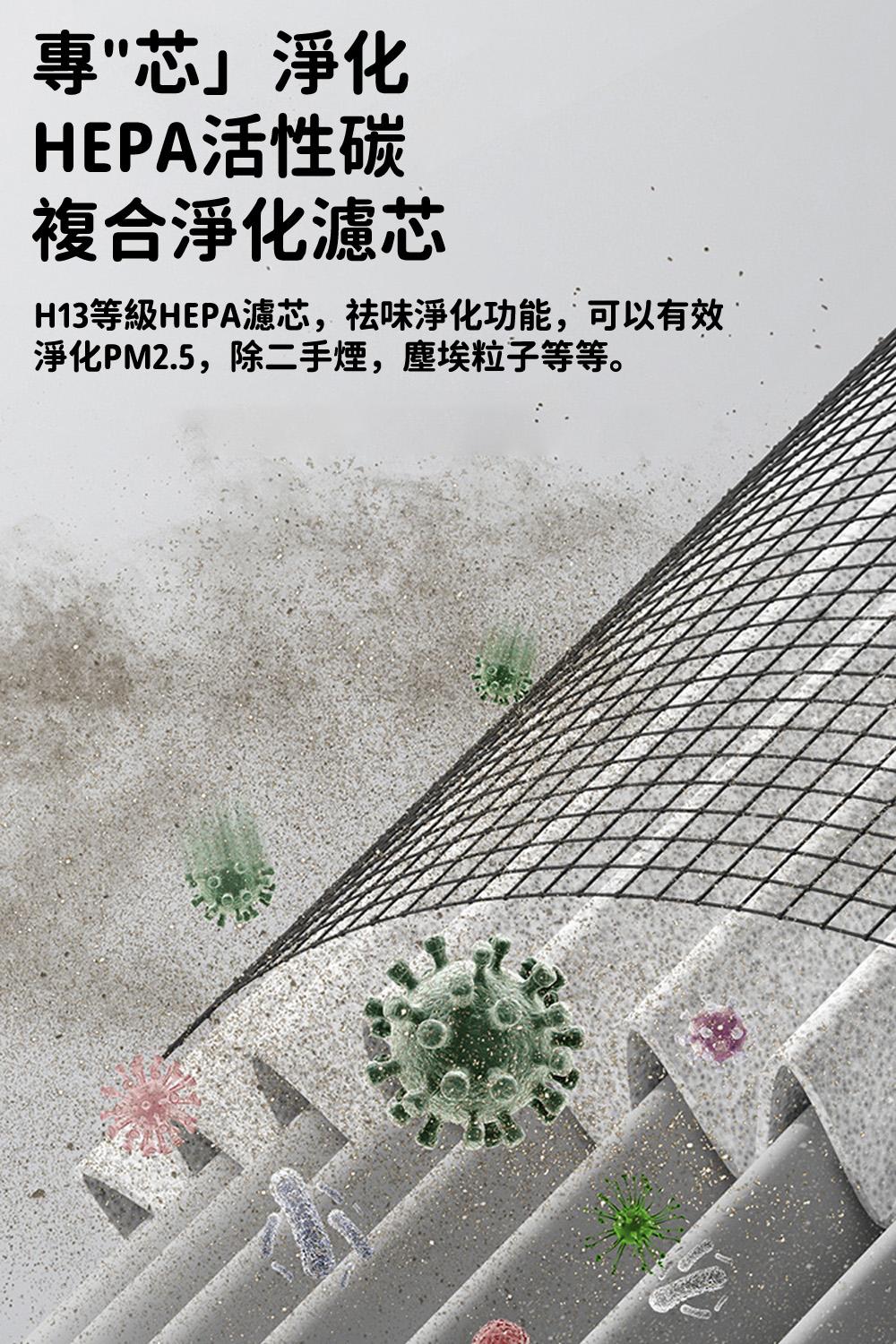 H13等級HEPA濾網,可有效凈化PM2.5、二手煙、塵埃粒子等汙染物