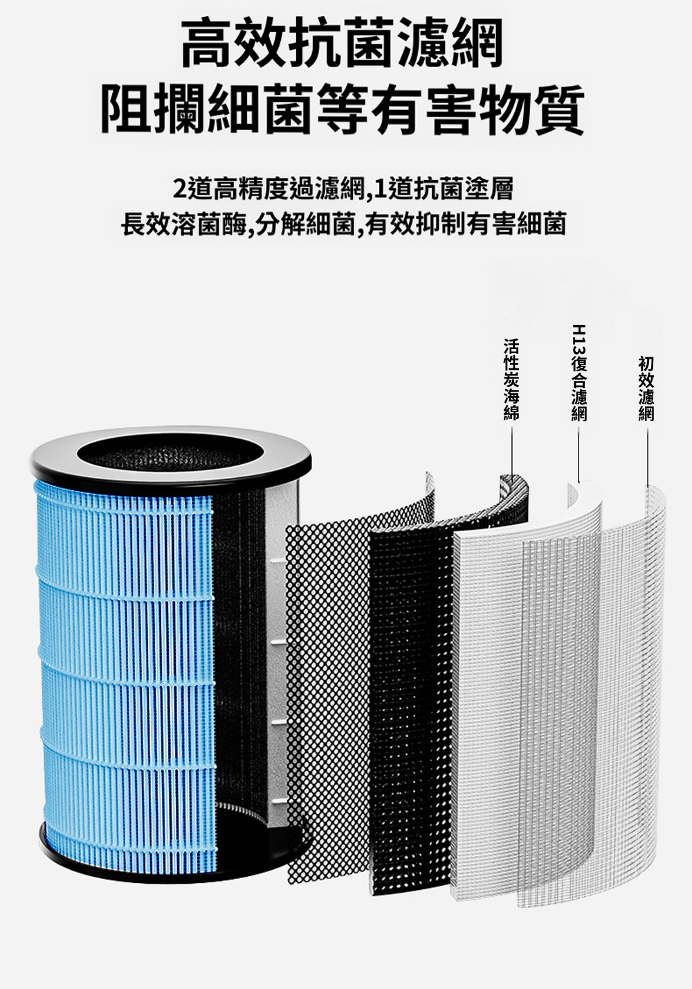 配備H13級高效復合濾網,結合初效濾網、活性炭海綿及長效溶菌酶抗菌塗層,四重過濾有效攔截顆粒物、吸附甲醛並抑製細菌滋生