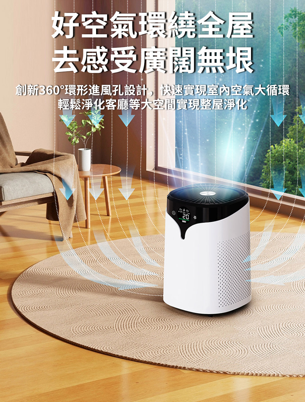 采用360°環形進風孔設計,結合優化塔式風道與光柵式出風口,實現室內空氣快速大循環,單臺設備即可滿足大空間凈化需求