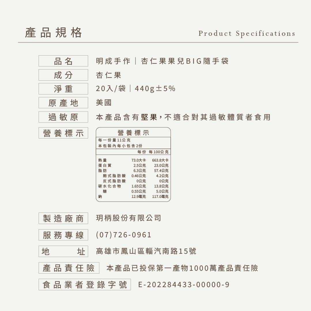 【MING CHENG 明成手作】BIG隨手袋系列《杏仁果》原味堅果/低溫烘焙/營養滿分/杏仁果/堅果/隨手包/無調味