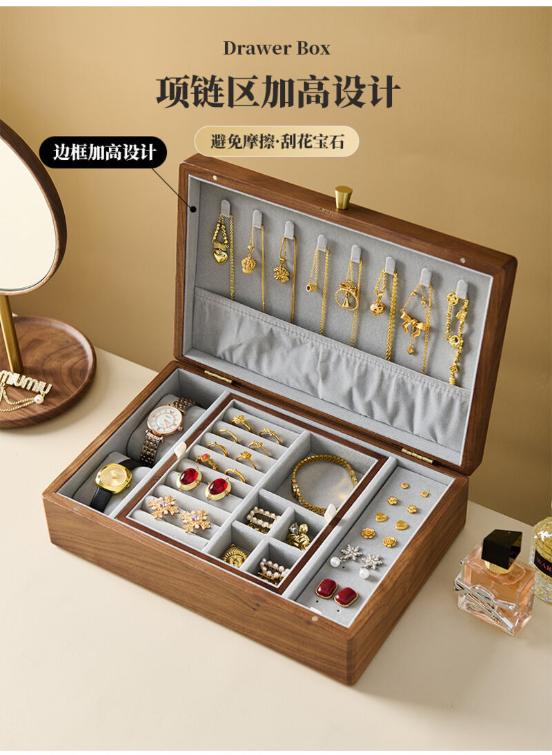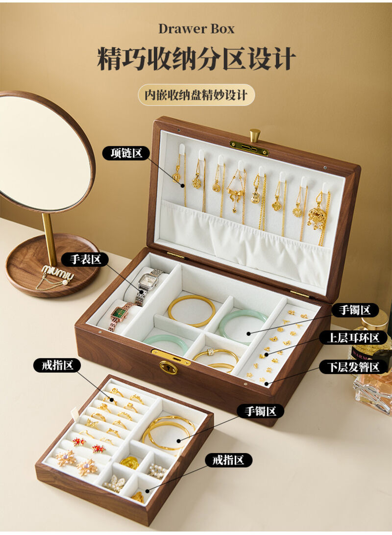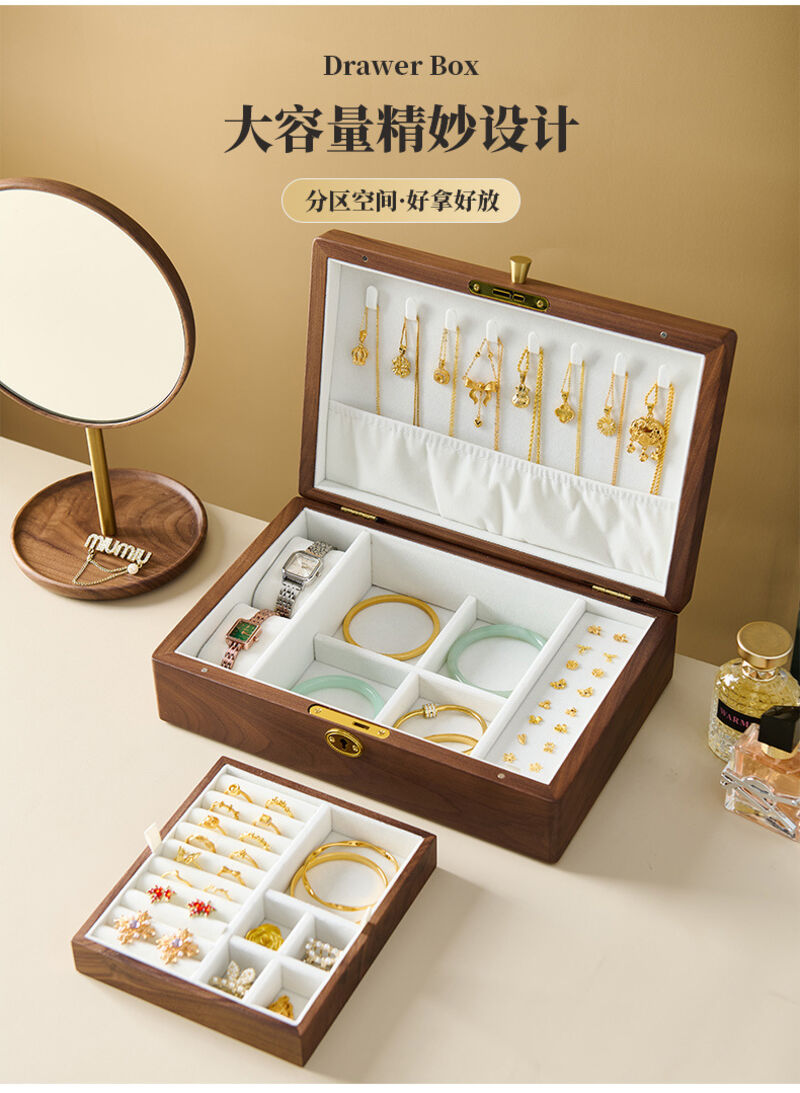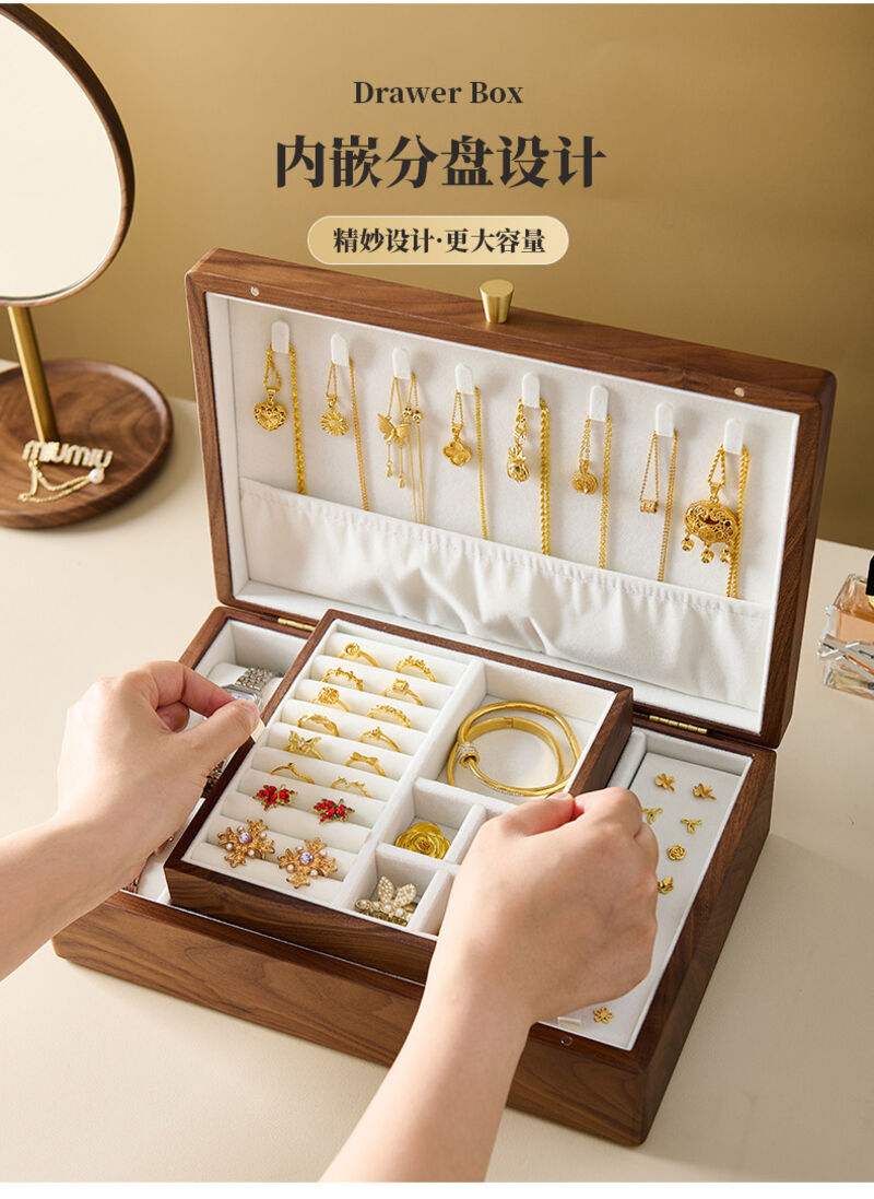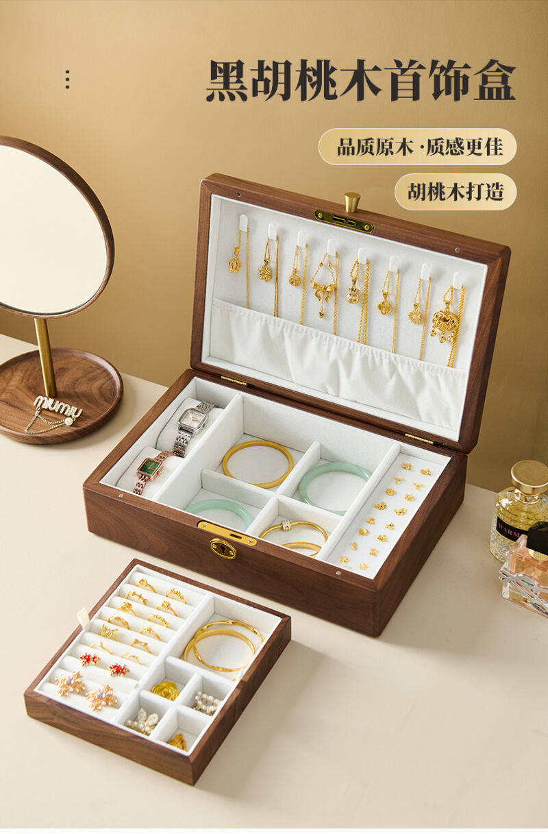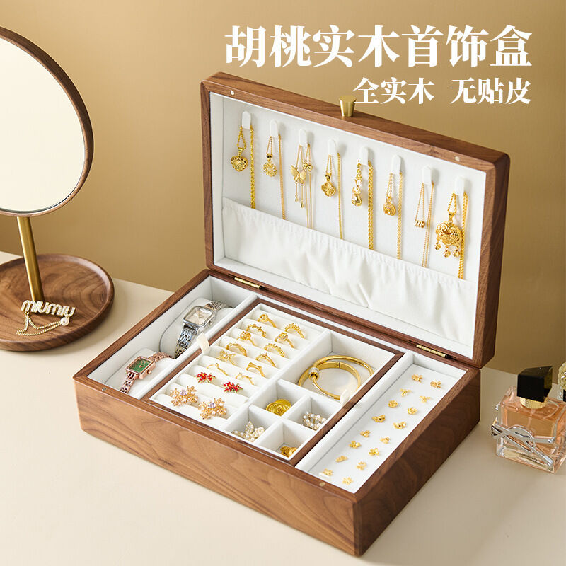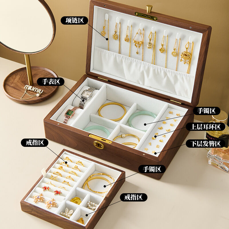 新品下殺 2025胡桃木首飾盒實木盒雙層新婚生日禮物木質小首飾收納盒