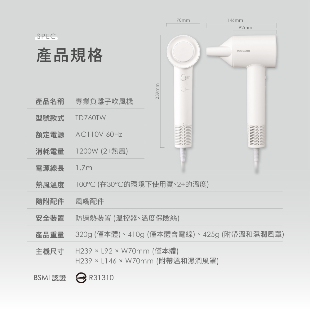 【TESCOM】🔸新色上市 🔸TESCOM TD760TW 羽量級 BLDC 專業負離子吹風機