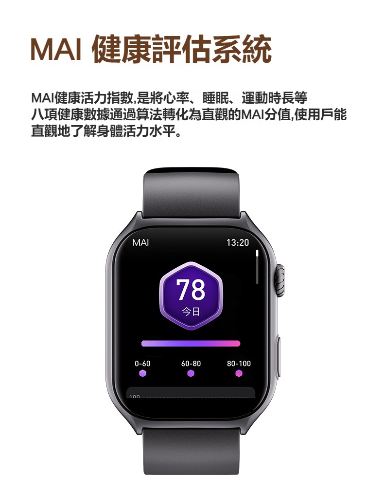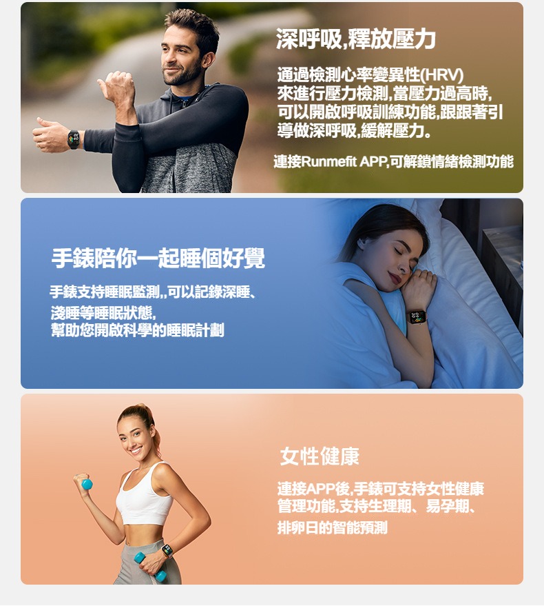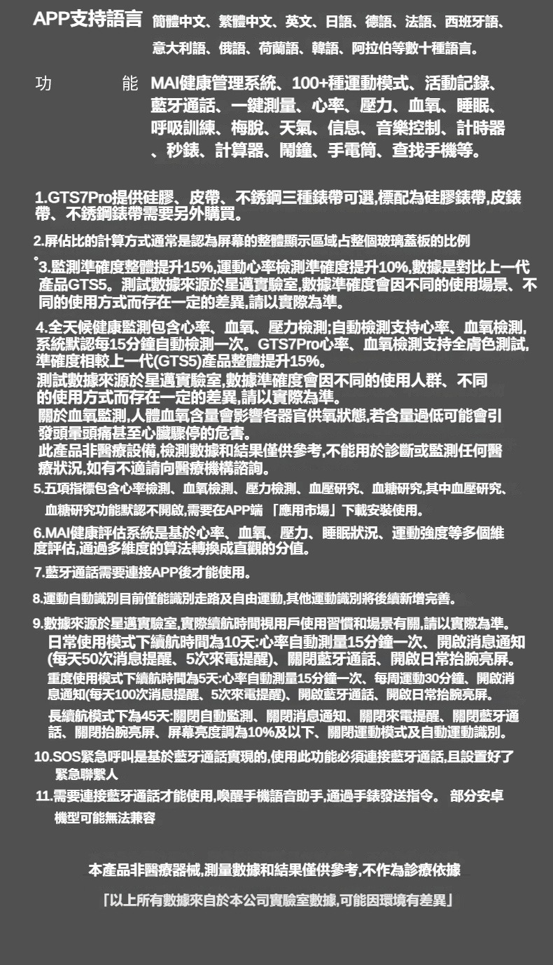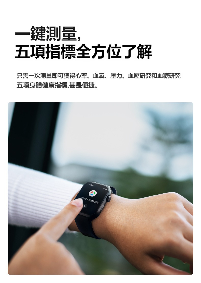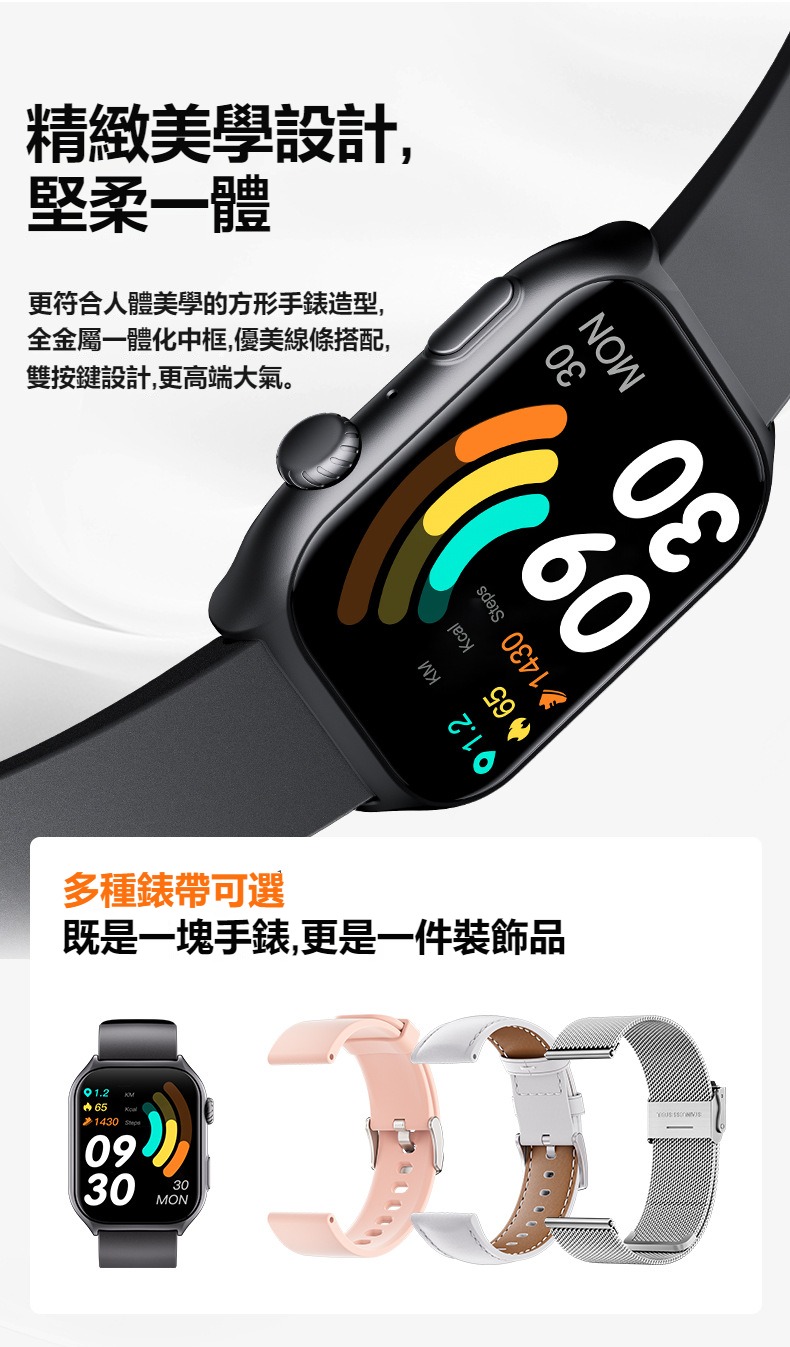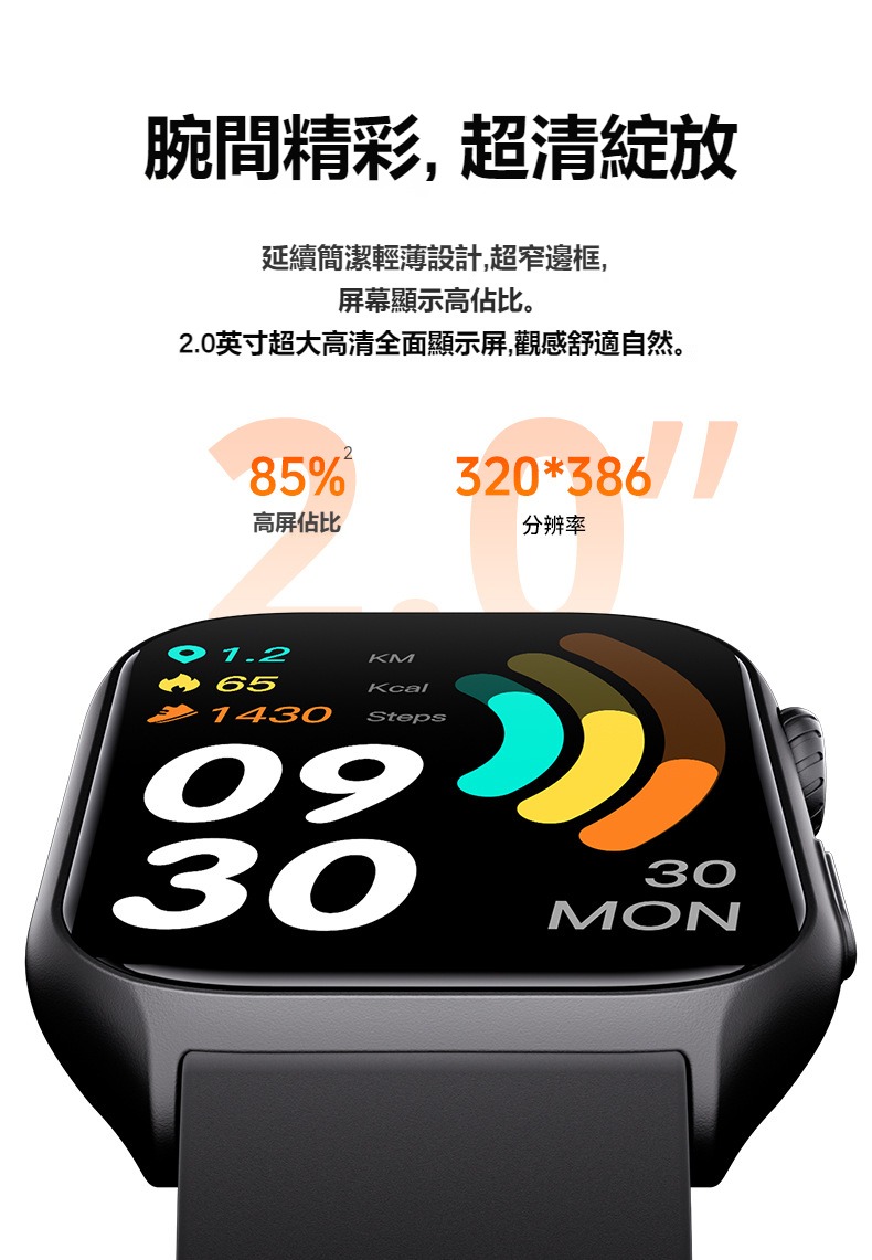 生活助手功能:智慧語言助理、鬧鐘、遙控拍照、秒錶、計時器、找手機、計算機、日曆、音樂控制、久坐提醒、天氣顯示