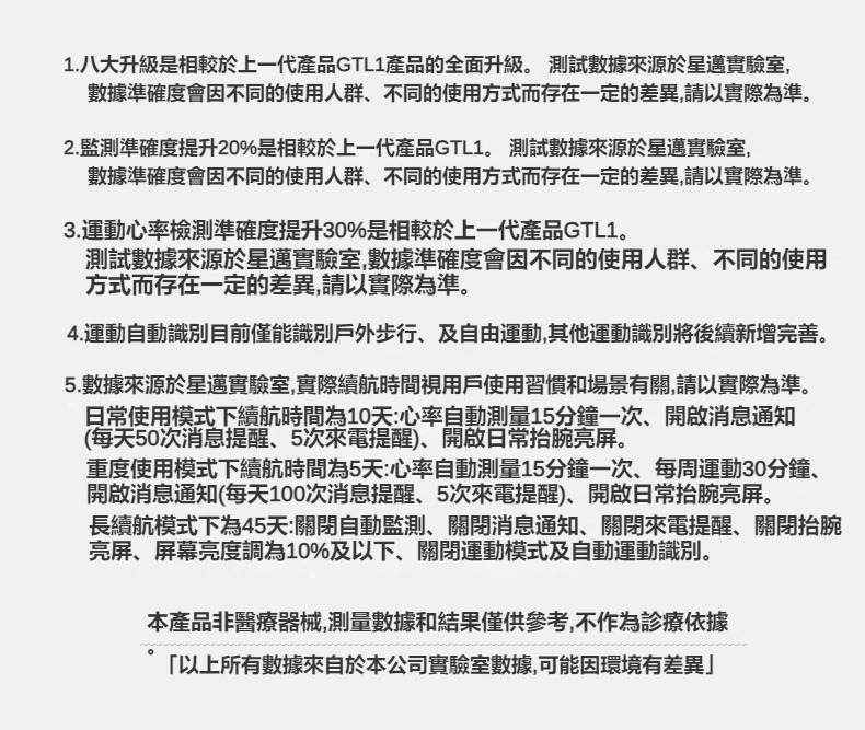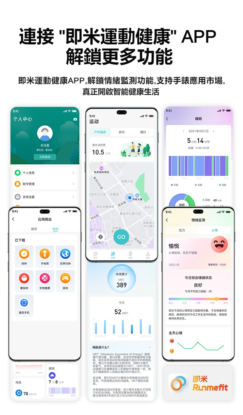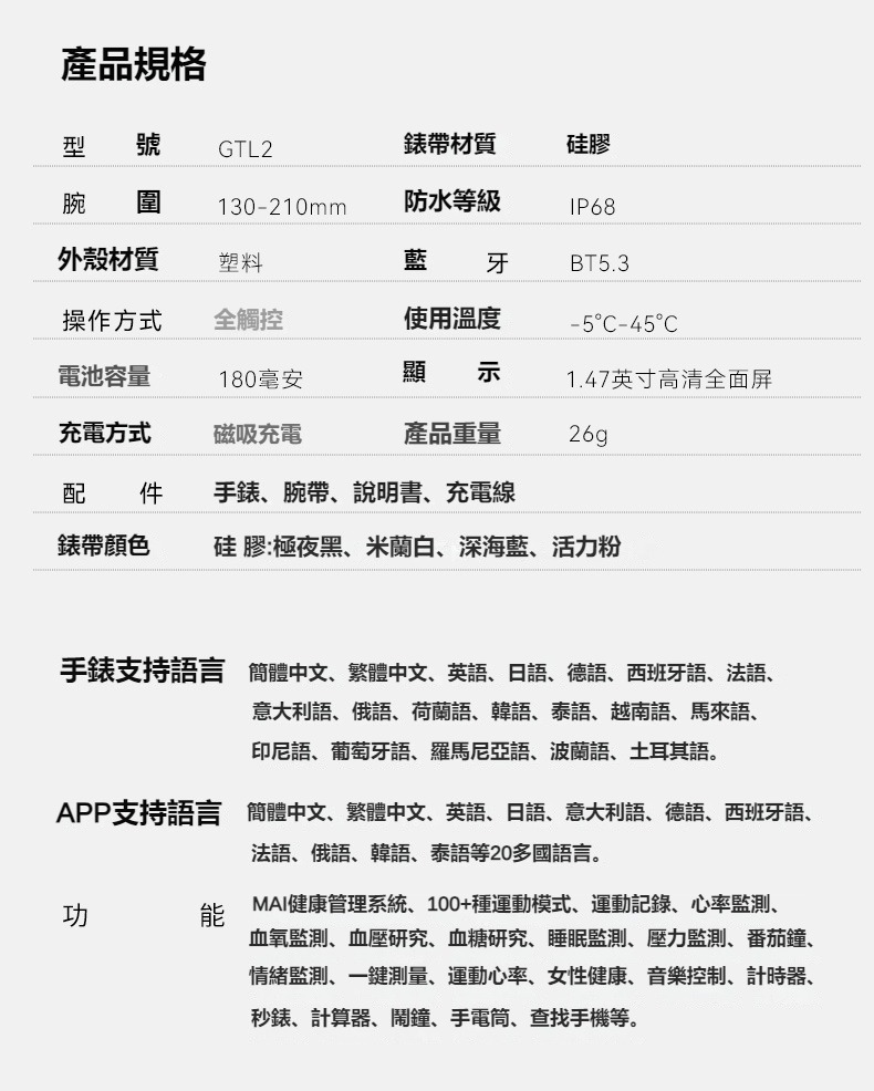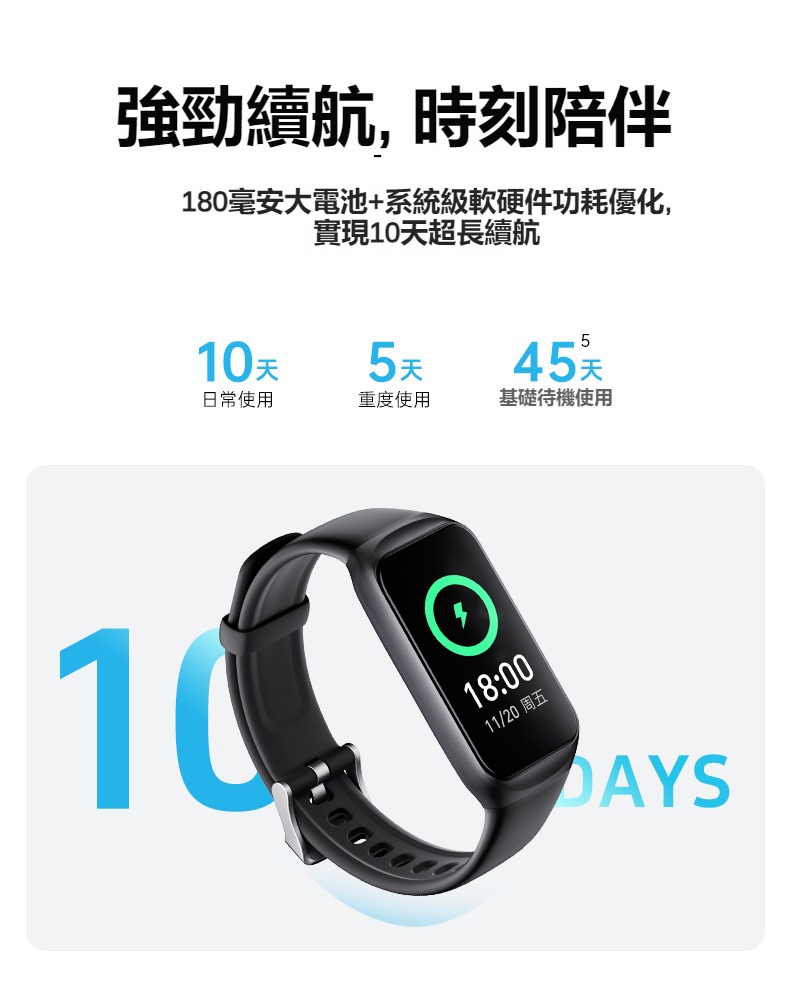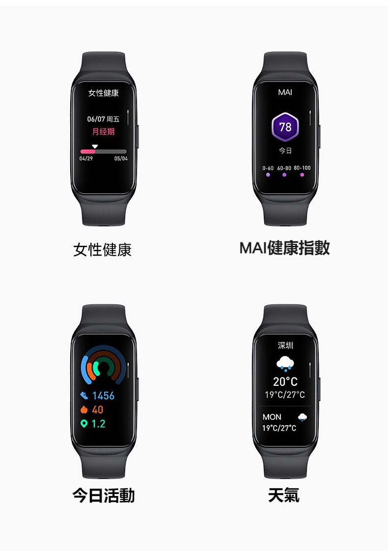 生活助手功能:智慧語言助理、鬧鐘、遙控拍照、秒錶、計時器、找手機、計算機、日曆、音樂控制、久坐提醒、天氣顯示