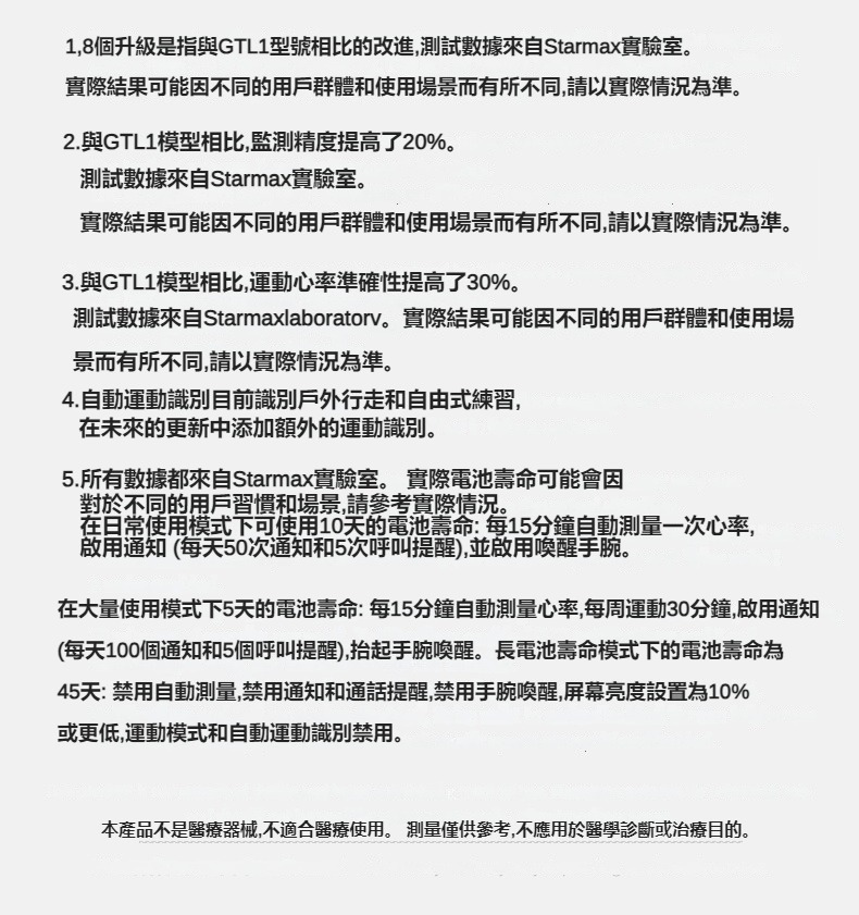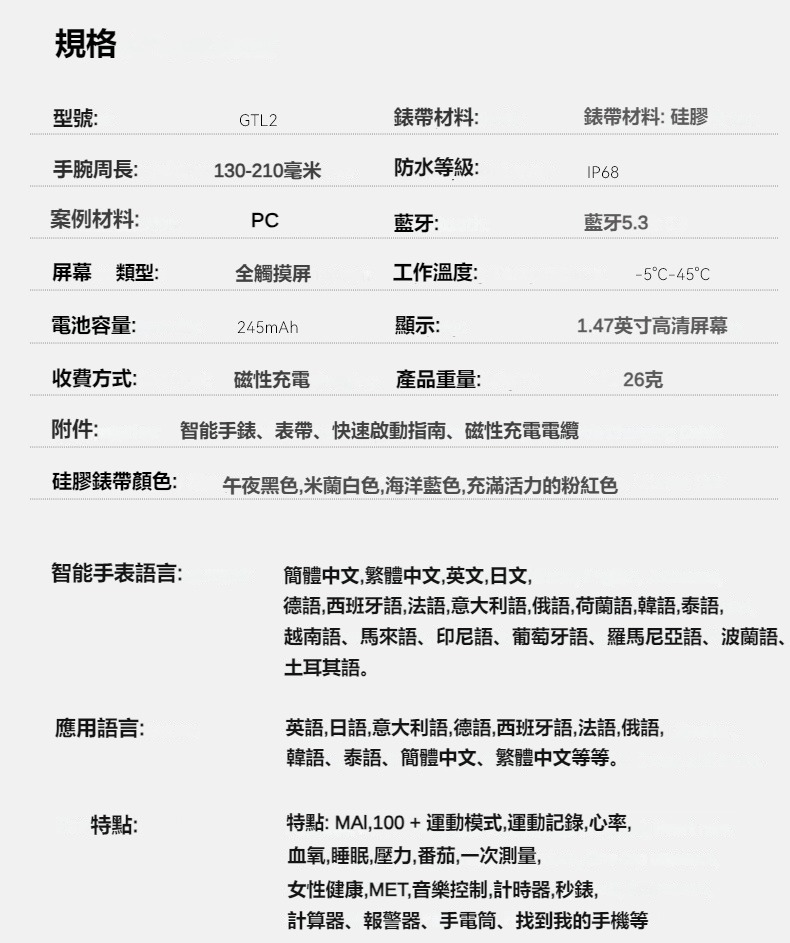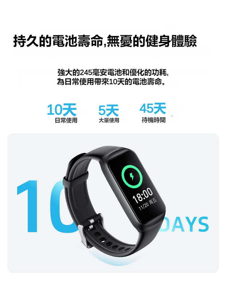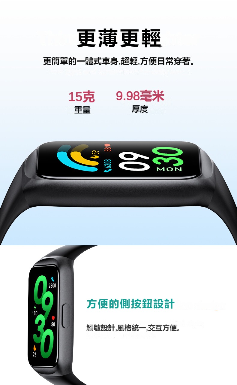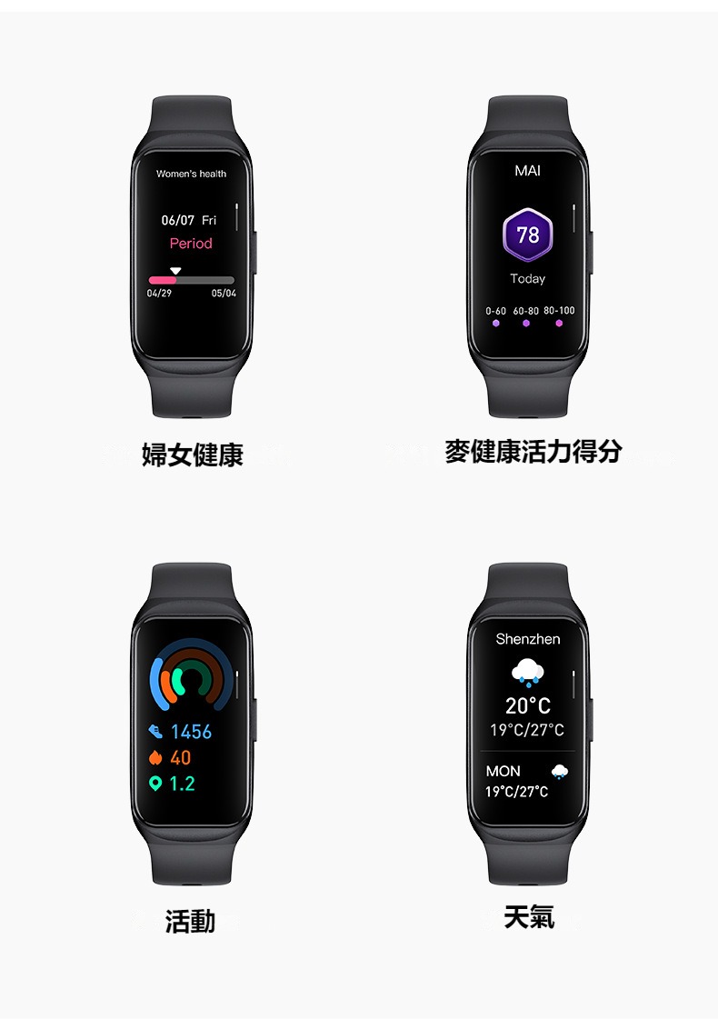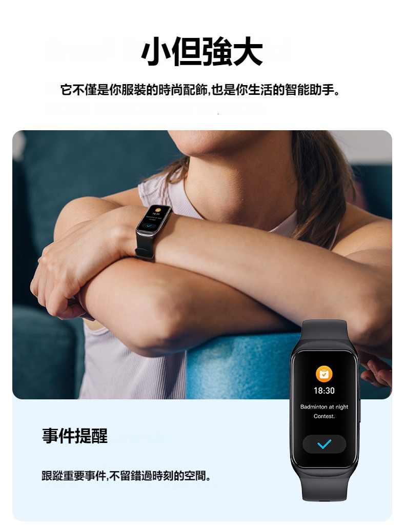 生活助手功能:智慧語言助理、鬧鐘、遙控拍照、秒錶、計時器、找手機、計算機、日曆、音樂控制、久坐提醒、天氣顯示