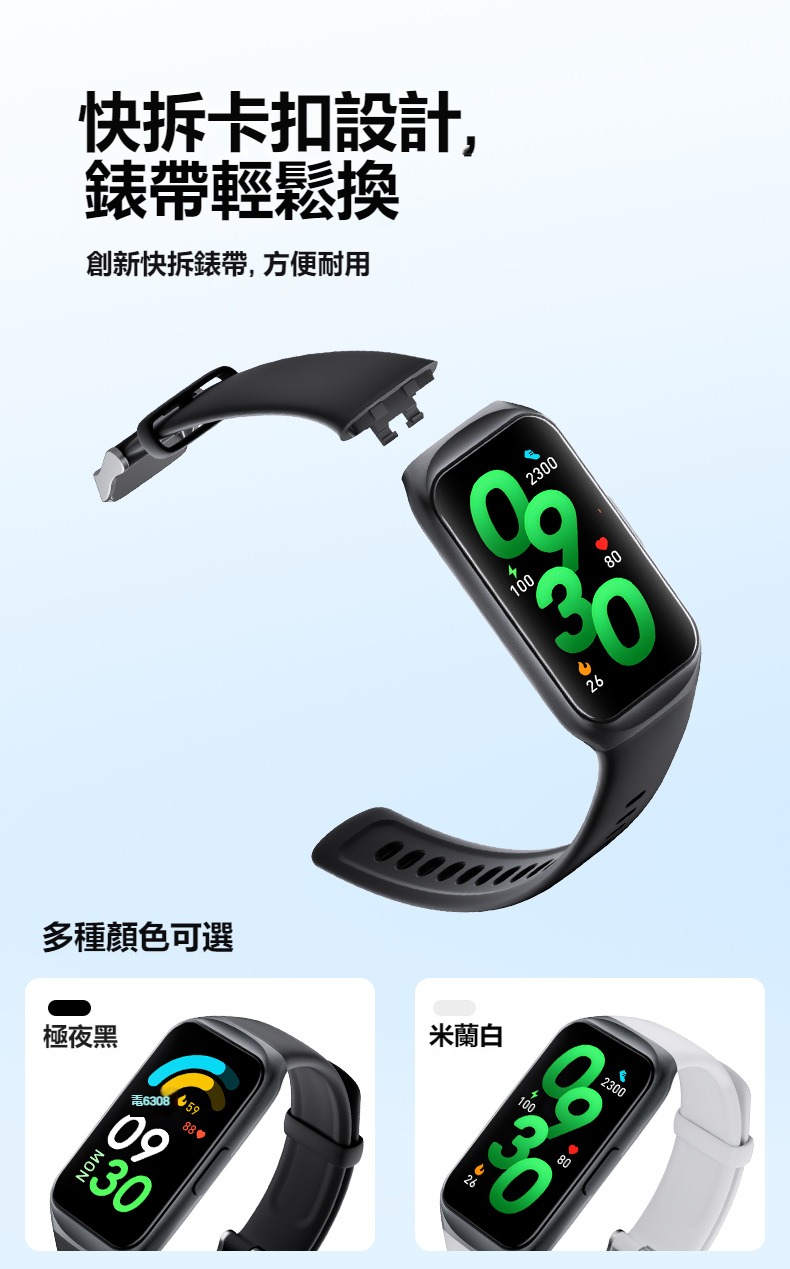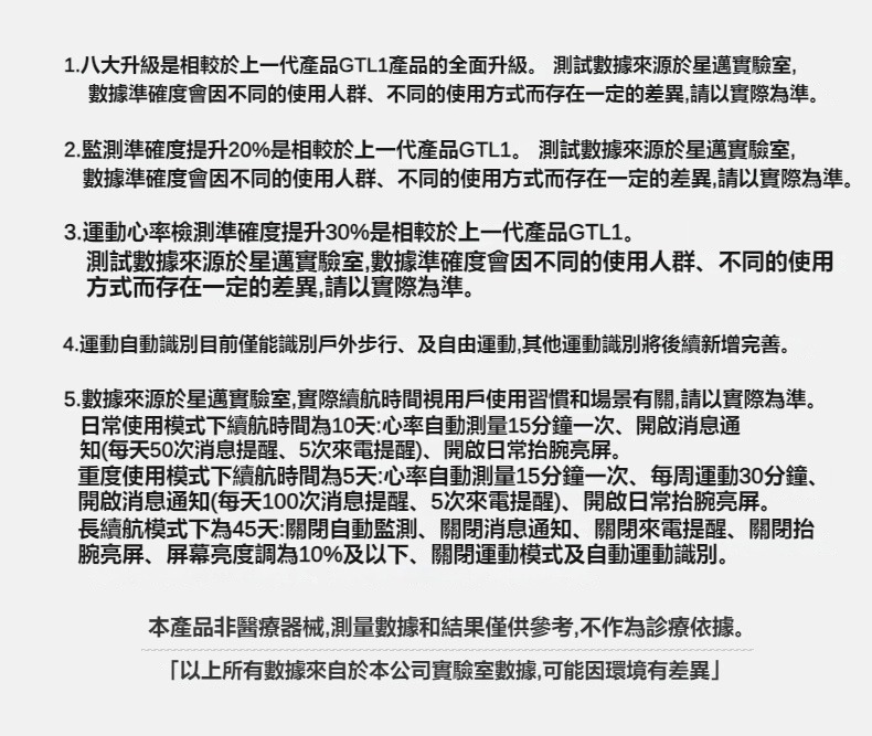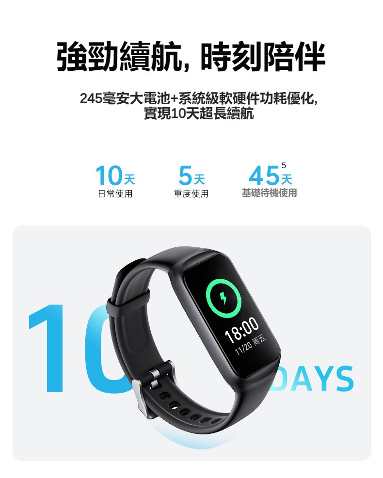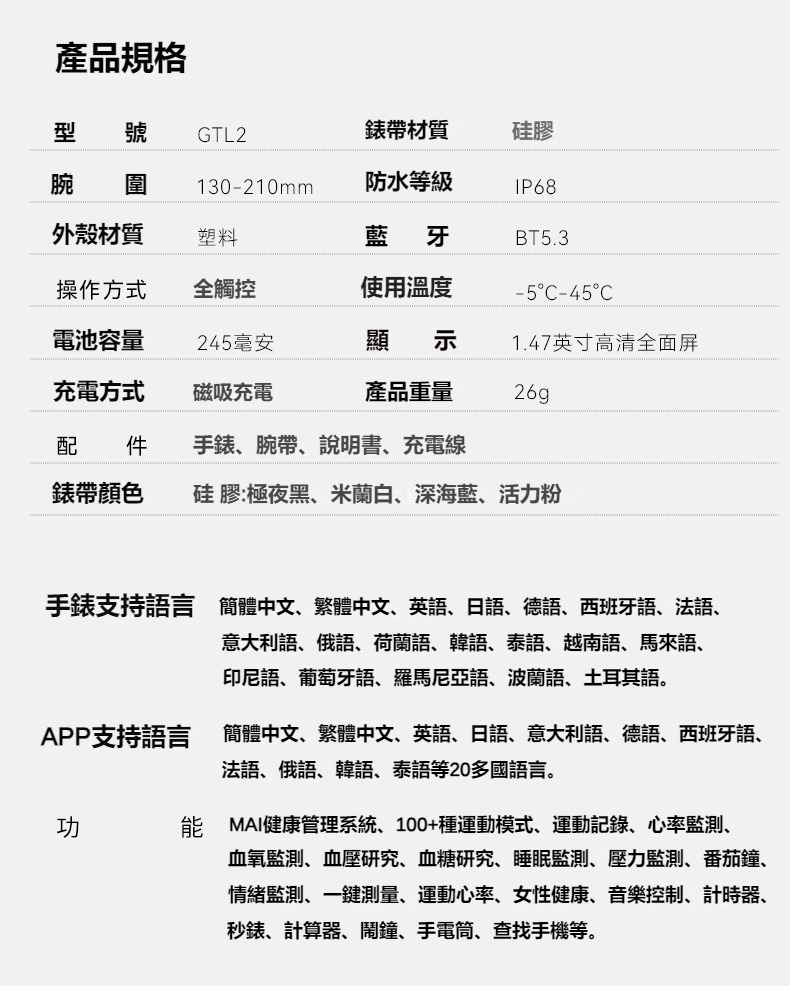 生活助手功能:智慧語言助理、鬧鐘、遙控拍照、秒錶、計時器、找手機、計算機、日曆、音樂控制、久坐提醒、天氣顯示