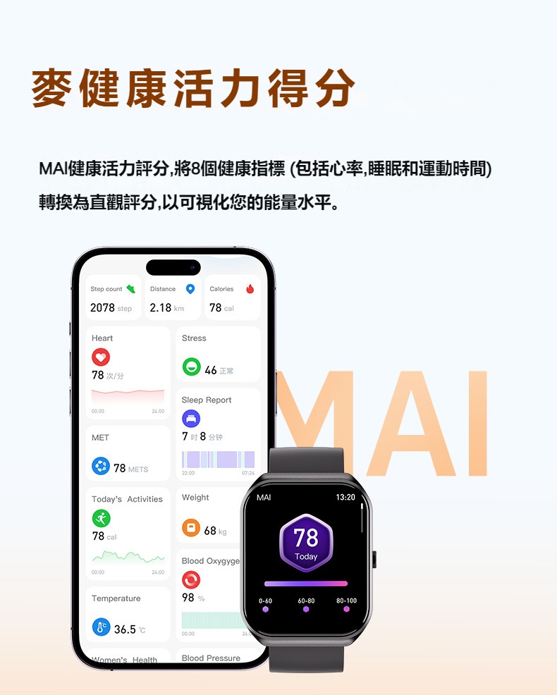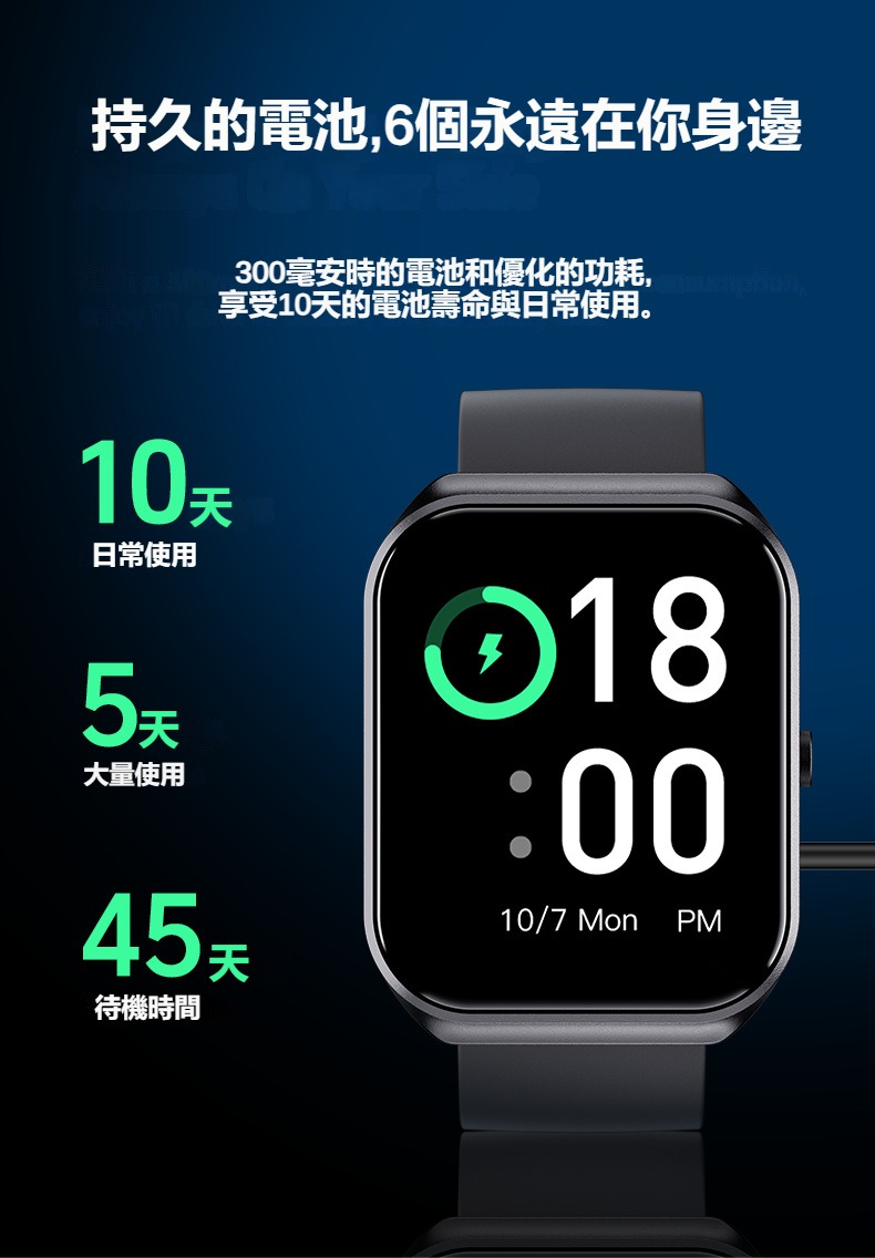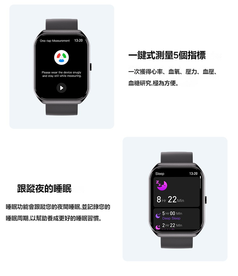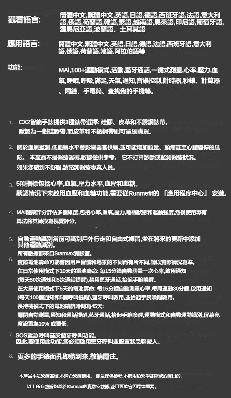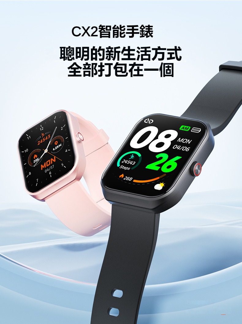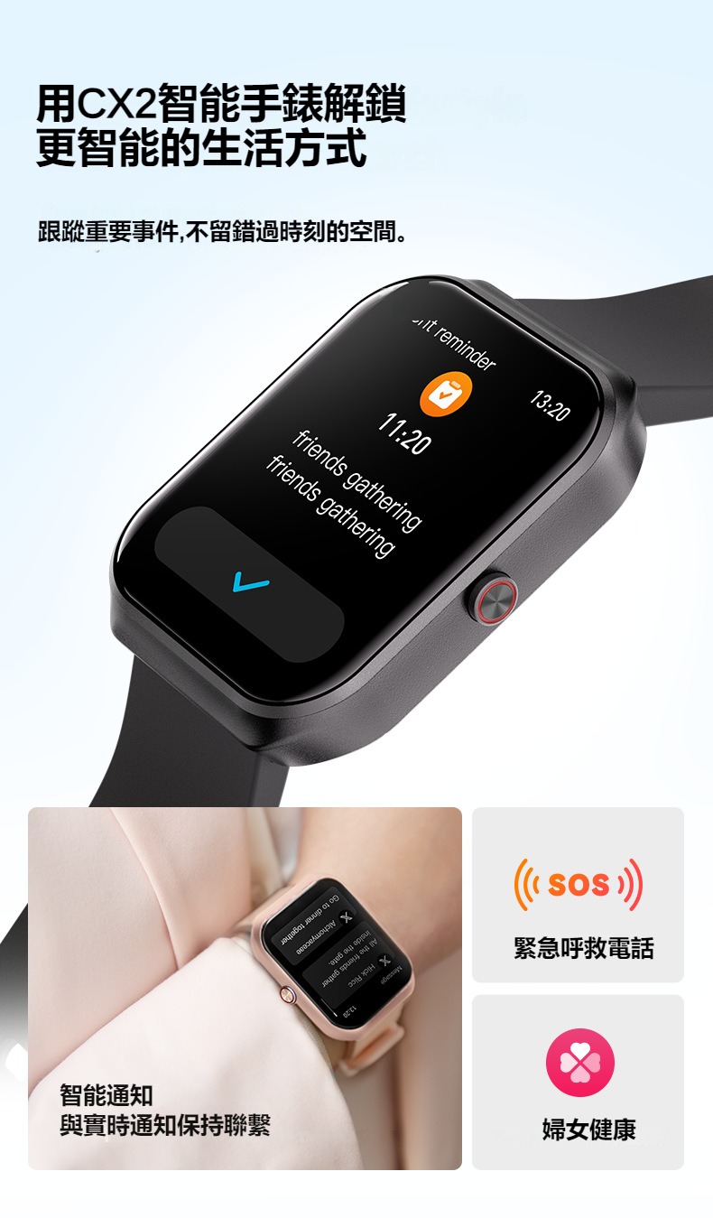 生活助手功能:智慧語言助理、鬧鐘、遙控拍照、秒錶、計時器、找手機、計算機、日曆、音樂控制、久坐提醒、天氣顯示