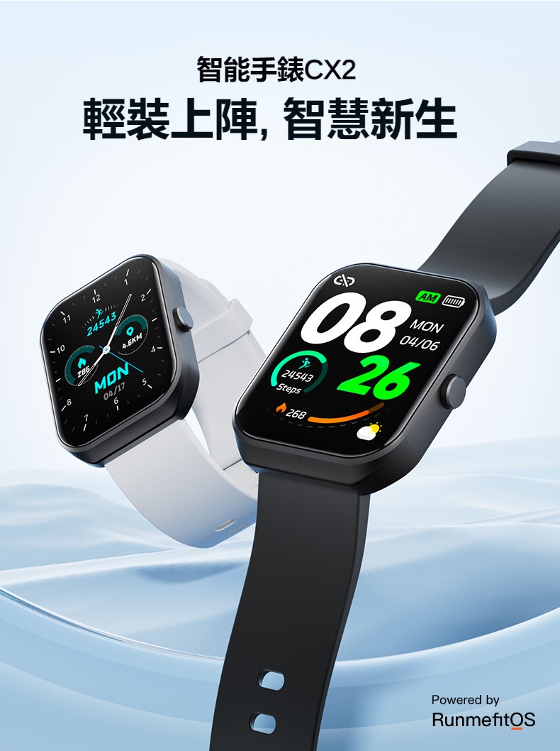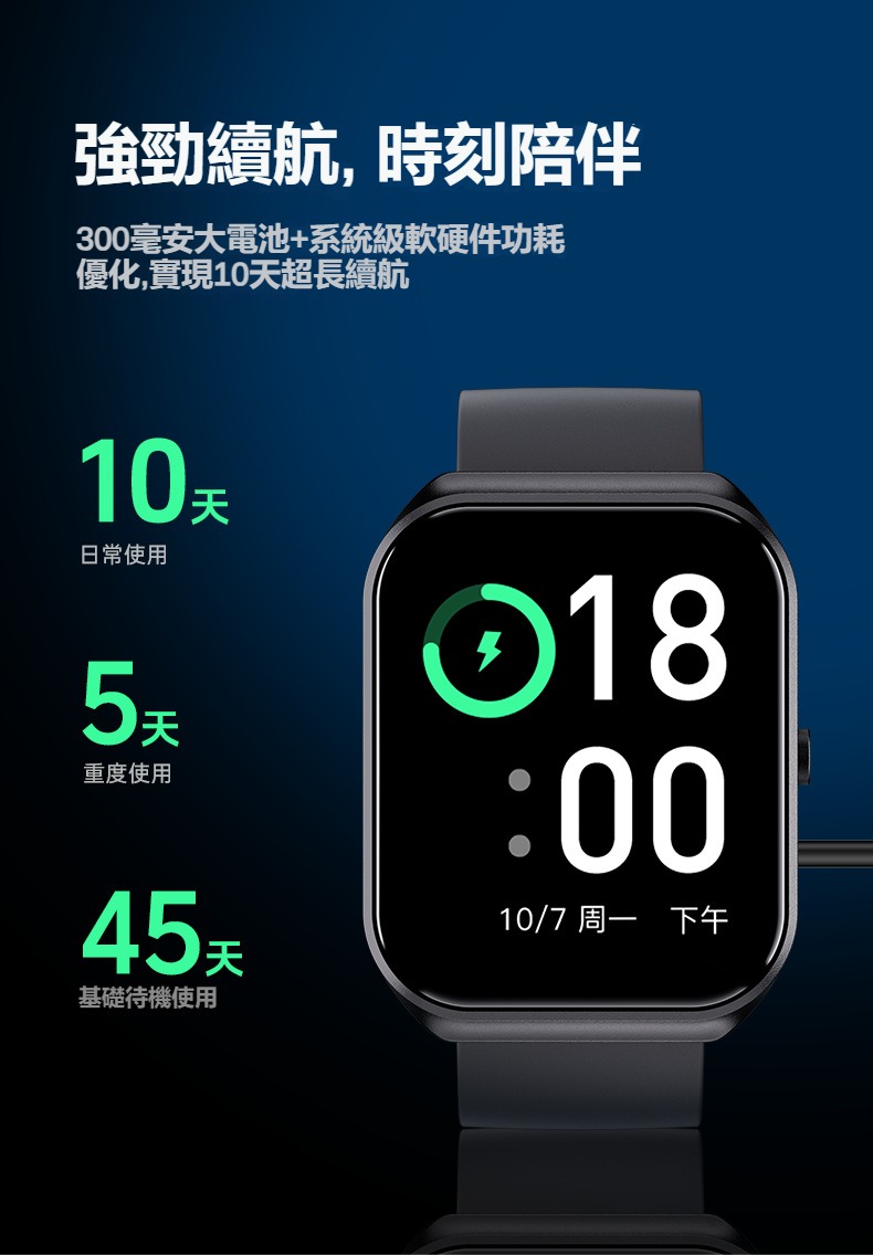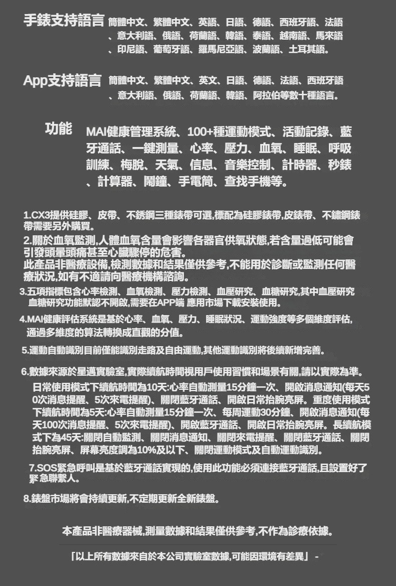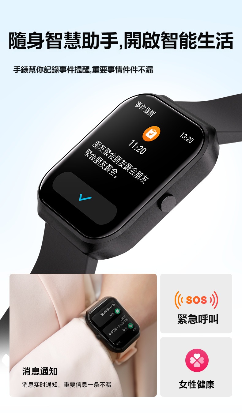 生活助手功能:智慧語言助理、鬧鐘、遙控拍照、秒錶、計時器、找手機、計算機、日曆、音樂控制、久坐提醒、天氣顯示
