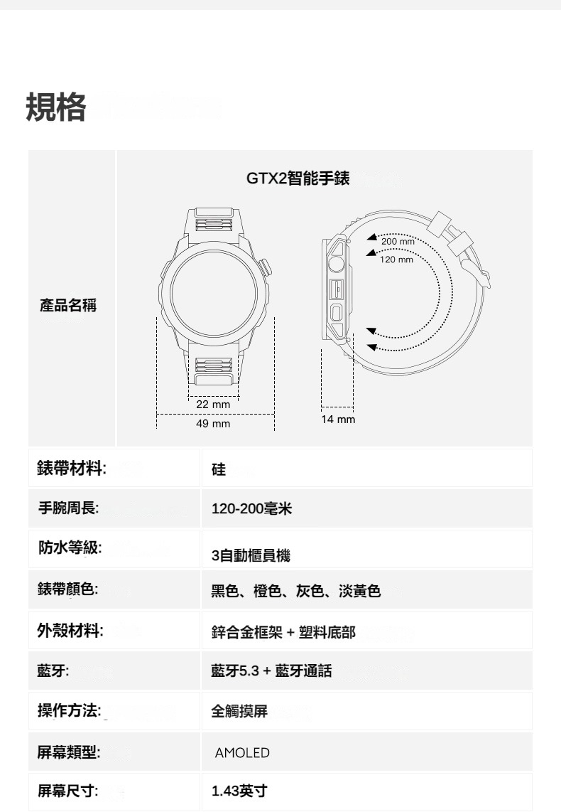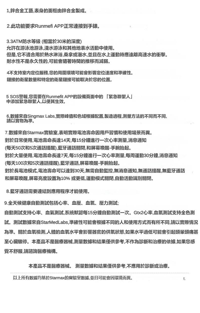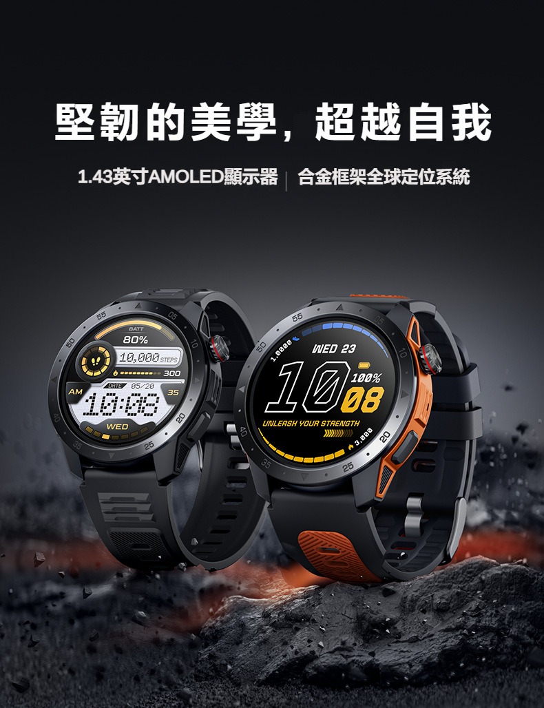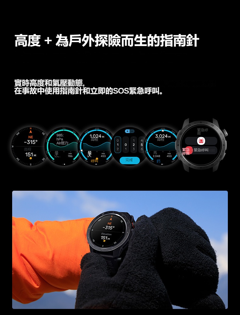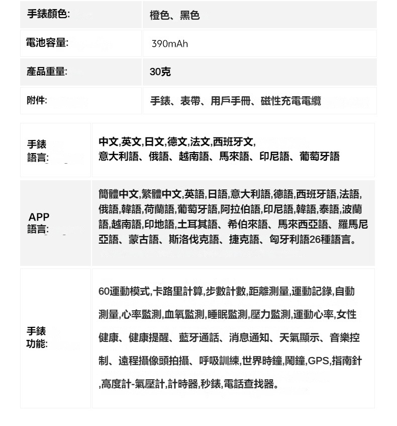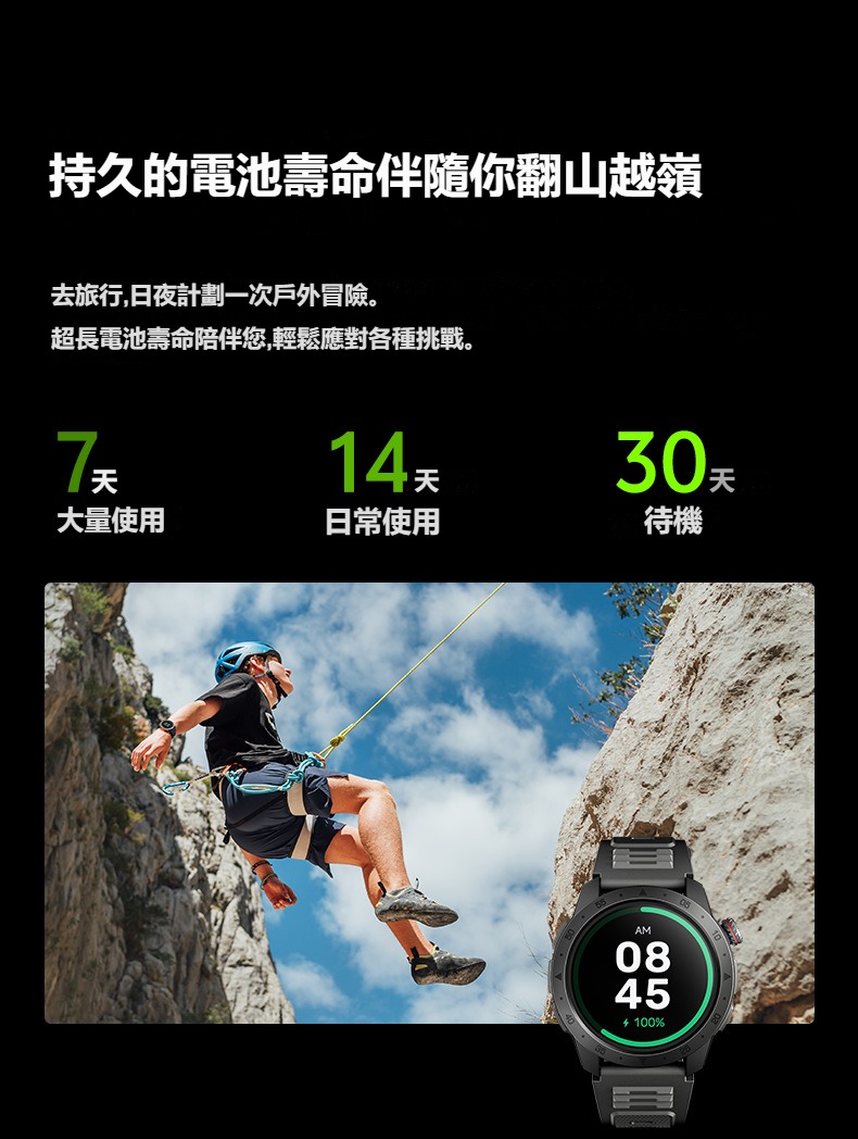 生活助手功能:智慧語言助理、鬧鐘、遙控拍照、秒錶、計時器、找手機、計算機、日曆、音樂控制、久坐提醒、天氣顯示