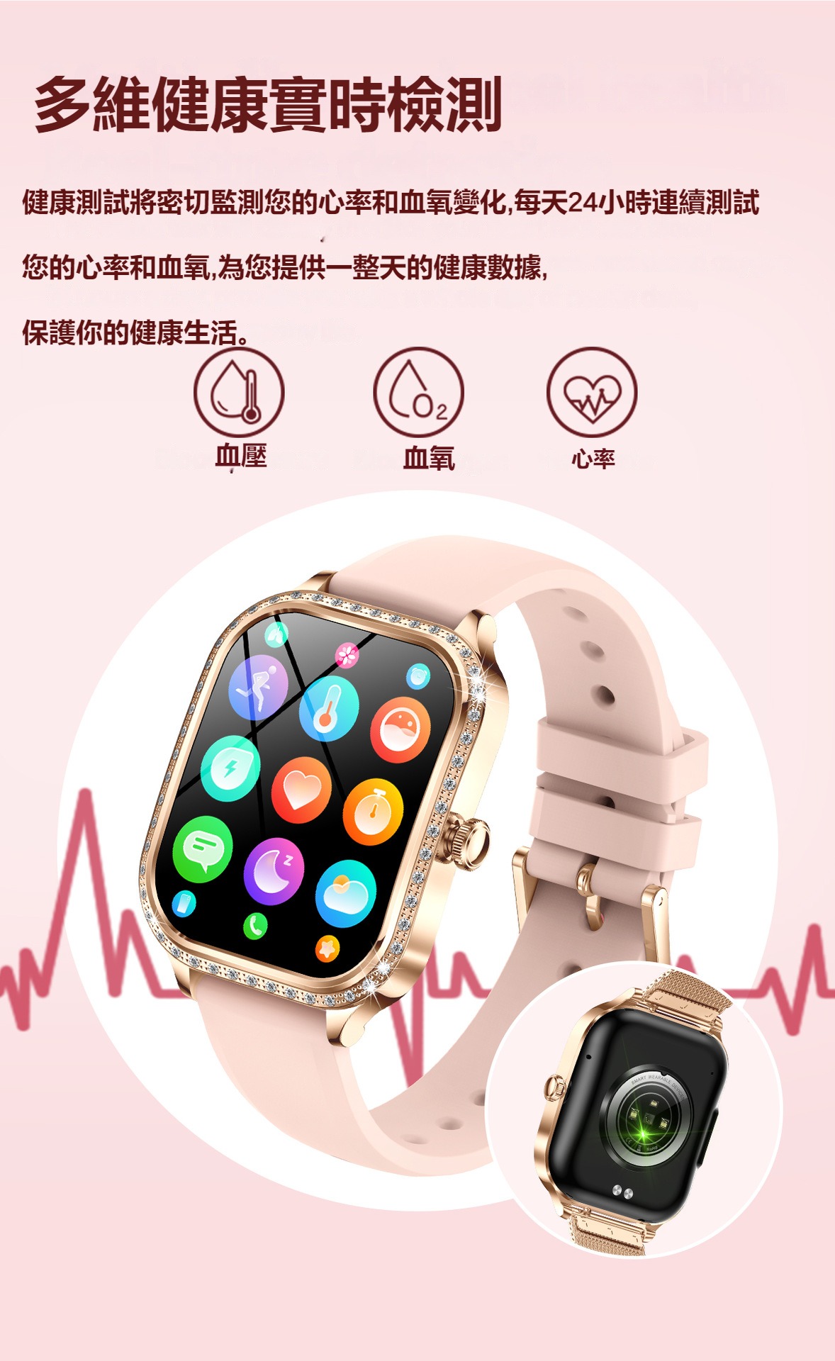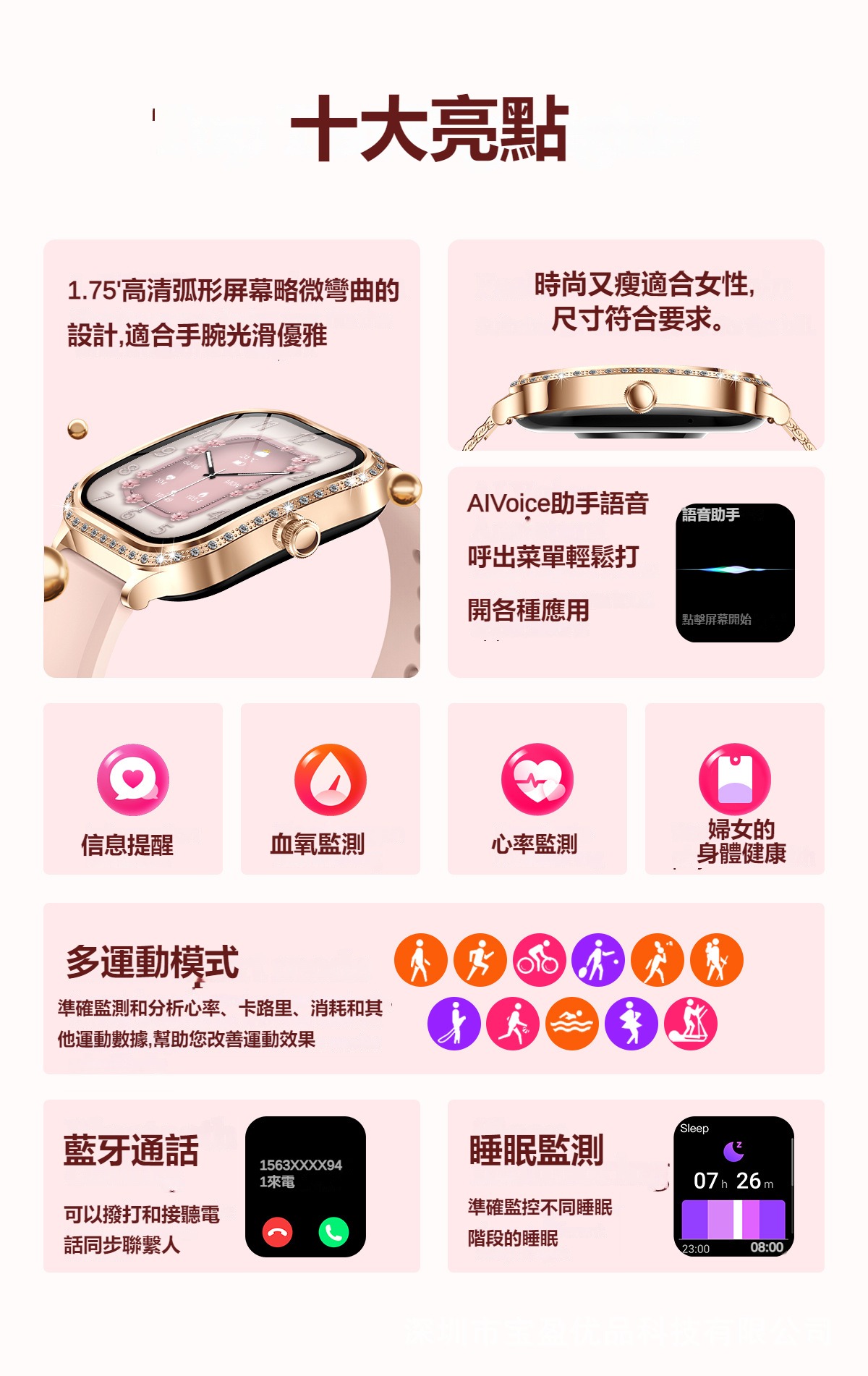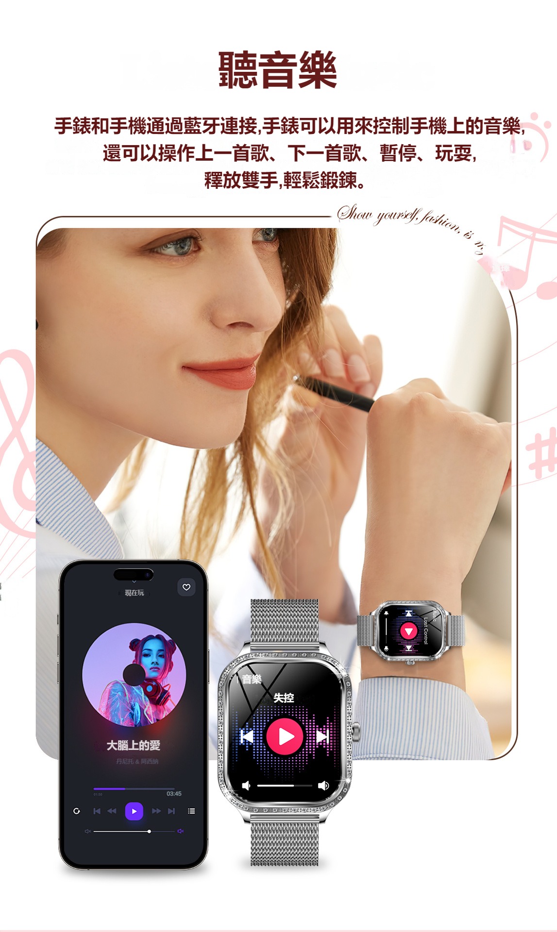生活助手功能:智慧語言助理、鬧鐘、遙控拍照、秒錶、計時器、找手機、計算機、日曆、音樂控制、久坐提醒、天氣顯示