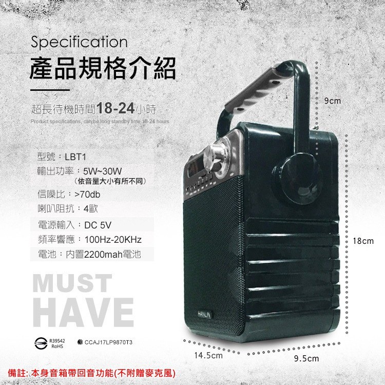 ※備註:本身音箱帶回音功能(不附贈麥克風),長按模式鍵可關閉LED燈
