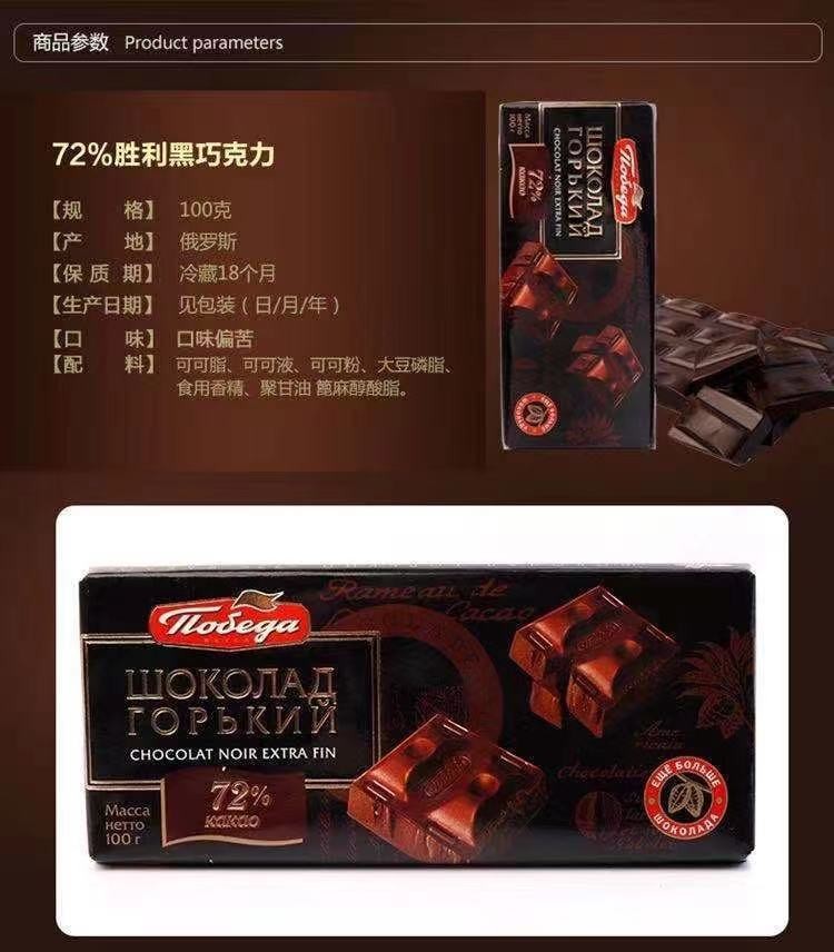 心心相印 俄羅斯進口勝利72%可可含量純黑苦巧克力休閒零食食品