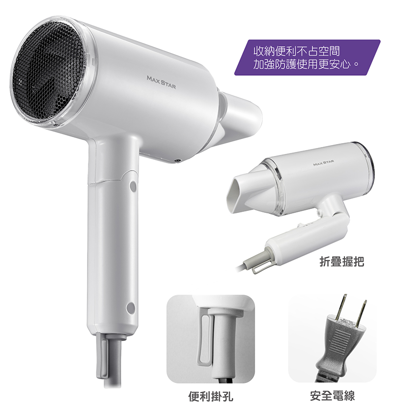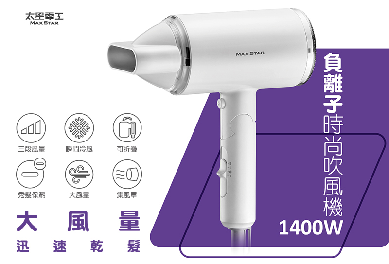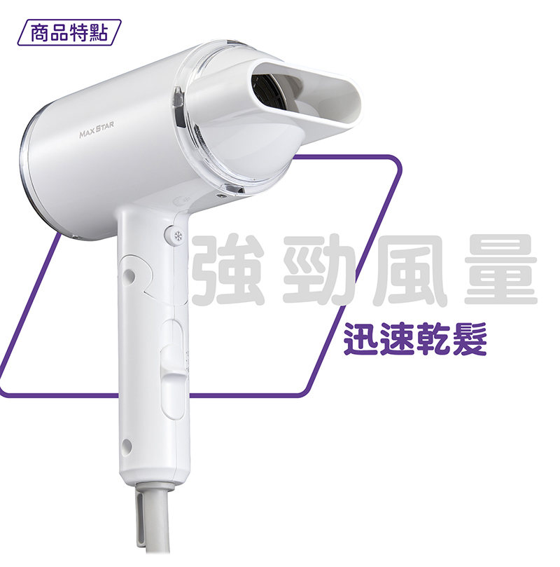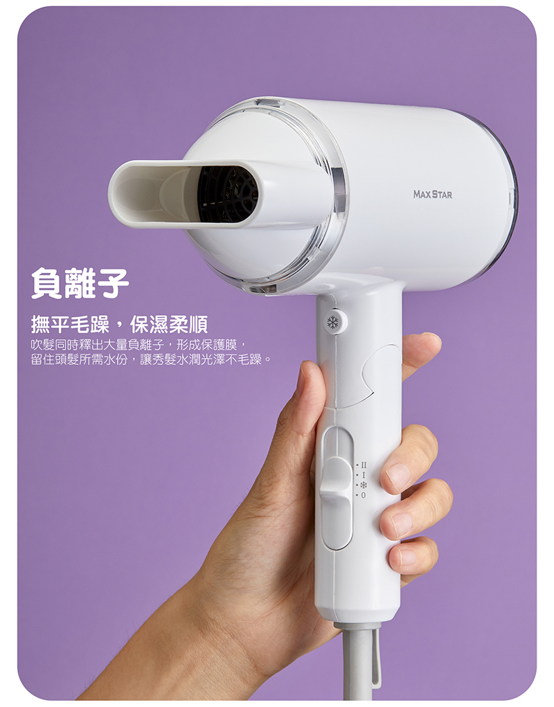1.負離子:撫平毛躁,保濕柔順,吹髮同時釋出大量負離子,形成保護膜,留住頭髮所需水份讓秀髮水潤光澤不毛躁。