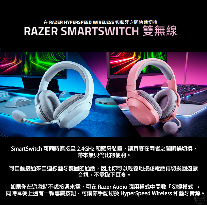 在 RAZER HYPERSPEED WIRELESS 和藍牙之間快速切換 -SmartSwitch 可同時連接至 2.4GHz 和藍牙裝置,讓耳麥在兩者之間順暢切換,帶來無與倫比的便利。可自動接通來自連線藍牙裝置的通話,因此你可以輕鬆地接聽電話再切換回遊戲音訊,不需取下耳麥。如果你在遊戲時不想接通來電,可在 Razer Audio 應用程式中開啟「勿擾模式」,同時耳麥上還有一顆專屬按鈕,可讓你手動切換 HyperSpeed Wireless 和藍牙音源。