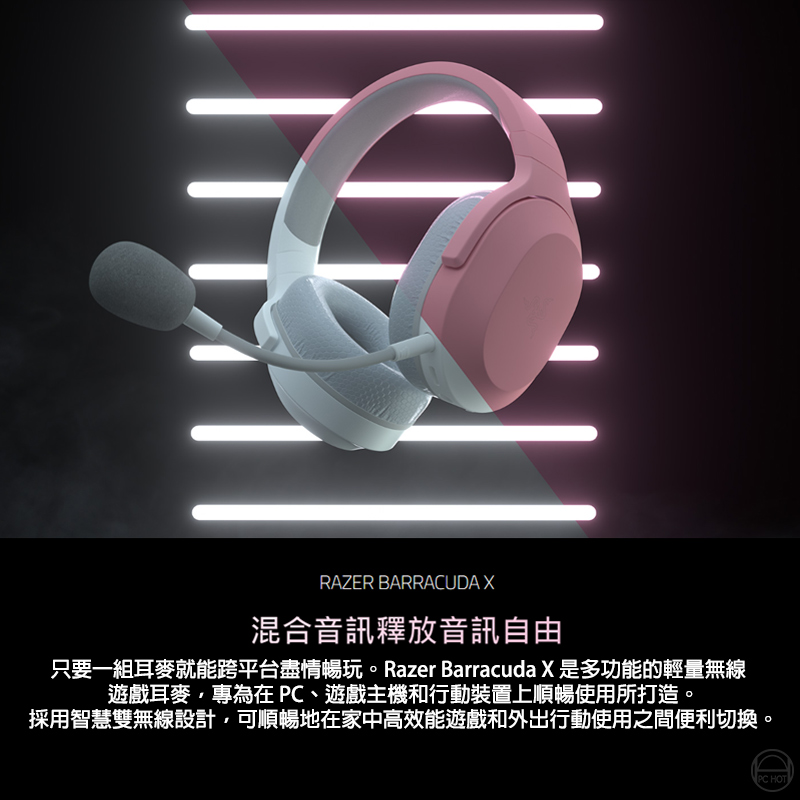 混合音訊釋放音訊自由 - 只要一組耳麥就能跨平台盡情暢玩。Razer Barracuda X 是多功能的輕量無線遊戲耳麥,專為在 PC、遊戲主機和行動裝置上順暢使用所打造。採用智慧雙無線設計,可順暢地在家中高效能遊戲和外出行動使用之間便利切換。