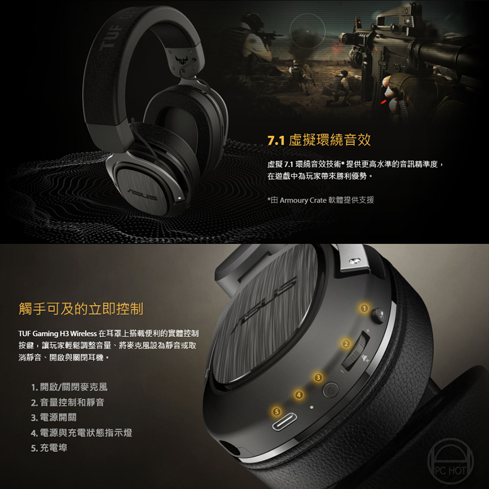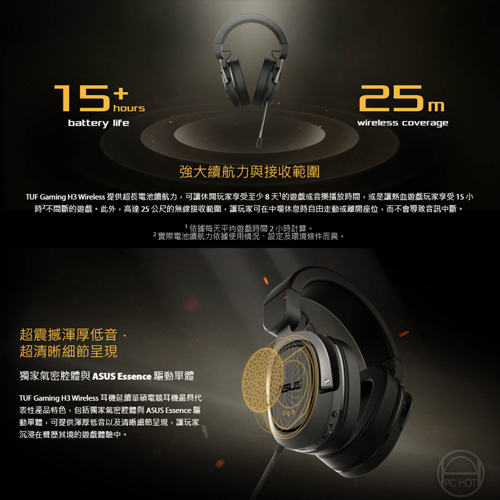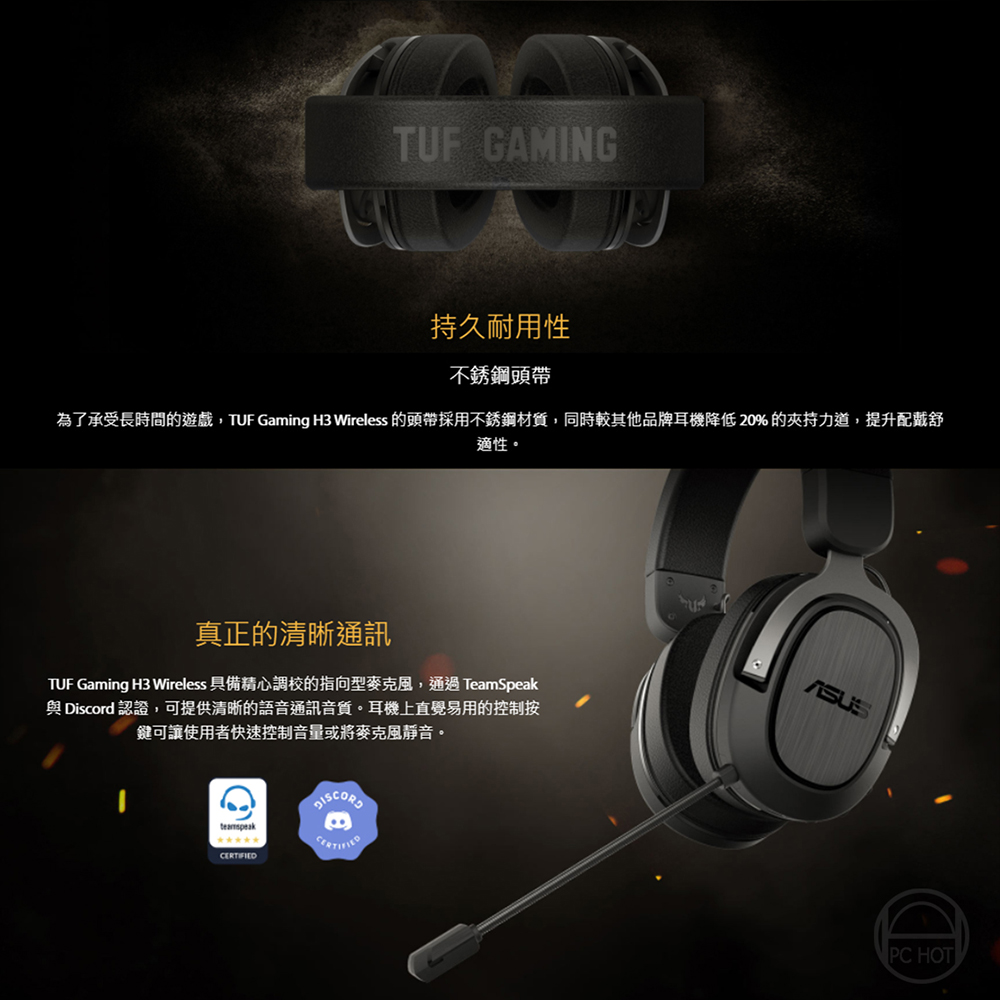 TUF Gaming H3 Wireless 耳機延續華碩電競耳機最具代表性產品特色,包括獨家氣密腔體與