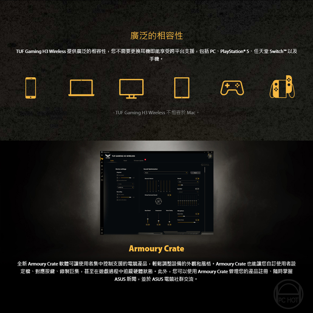 TUF Gaming H3 Wireless 提供廣泛的相容性,您不需要更換耳機即能享受跨平台支援,包括 PC、PlayStation® 5、任天堂 Switch™ 以及手機。