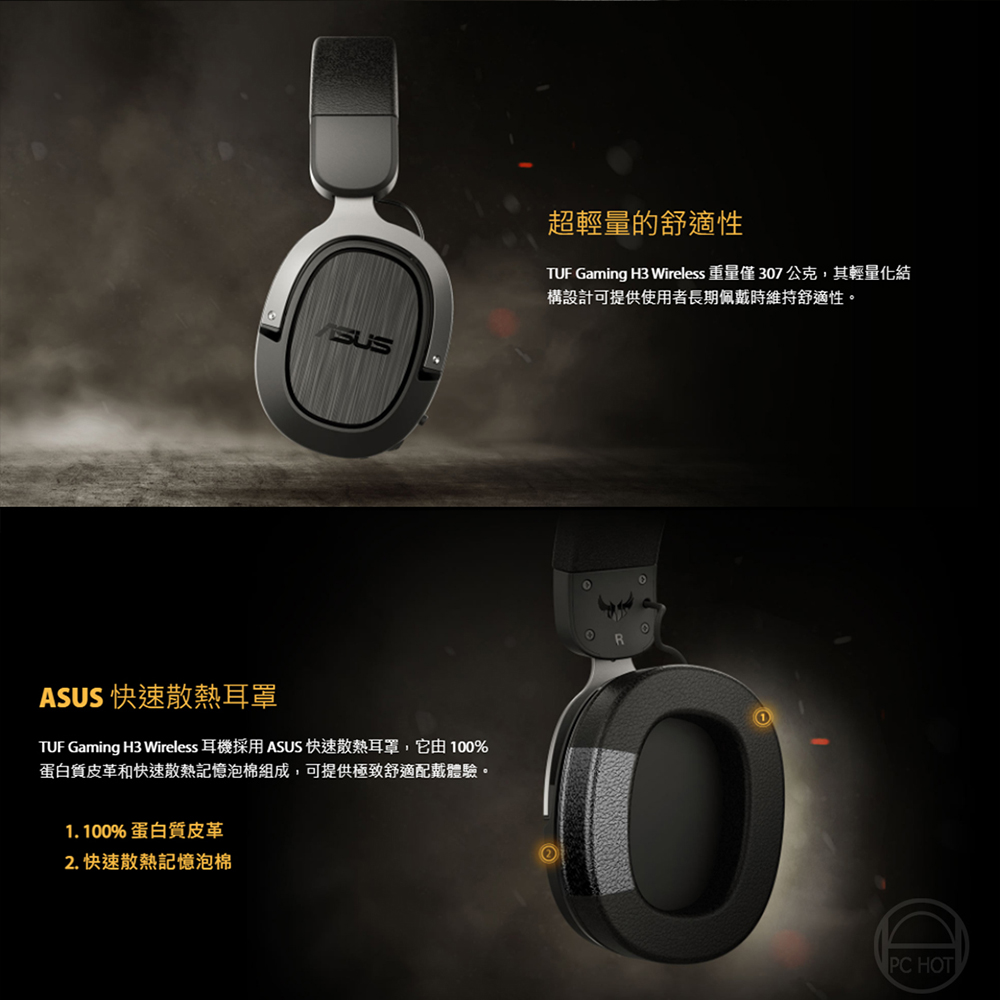 TUF Gaming H3 Wireless 耳機採用 ASUS 快速散熱耳罩,它由 100% 蛋白質皮革和快速散熱記憶泡棉組成,可提供極致舒適配戴體驗。