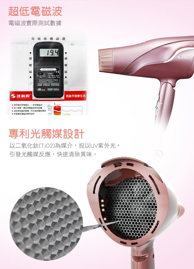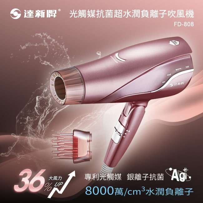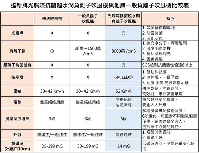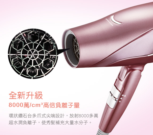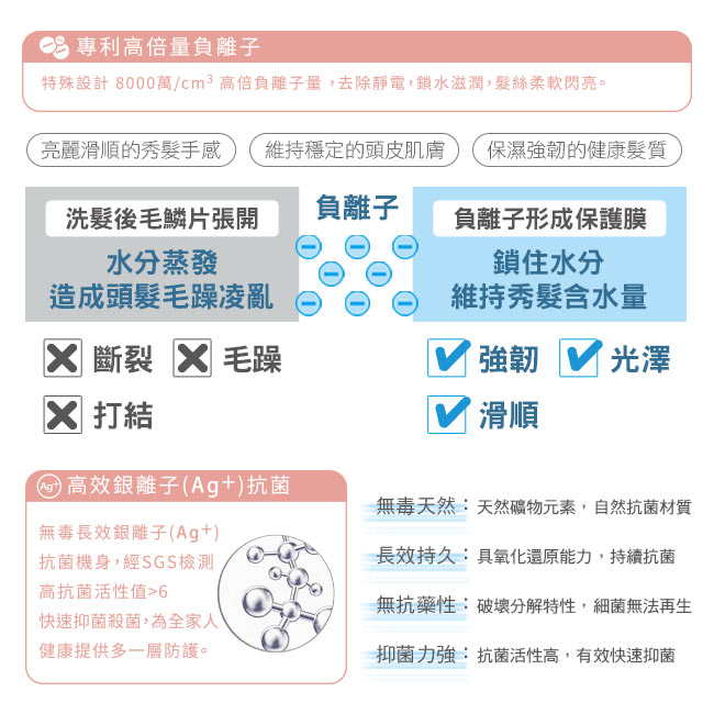特殊設計8000萬/cm3高倍負離子量,去除靜電、鎖水滋潤增添?絲柔亮,減少毛燥與斷裂之特性