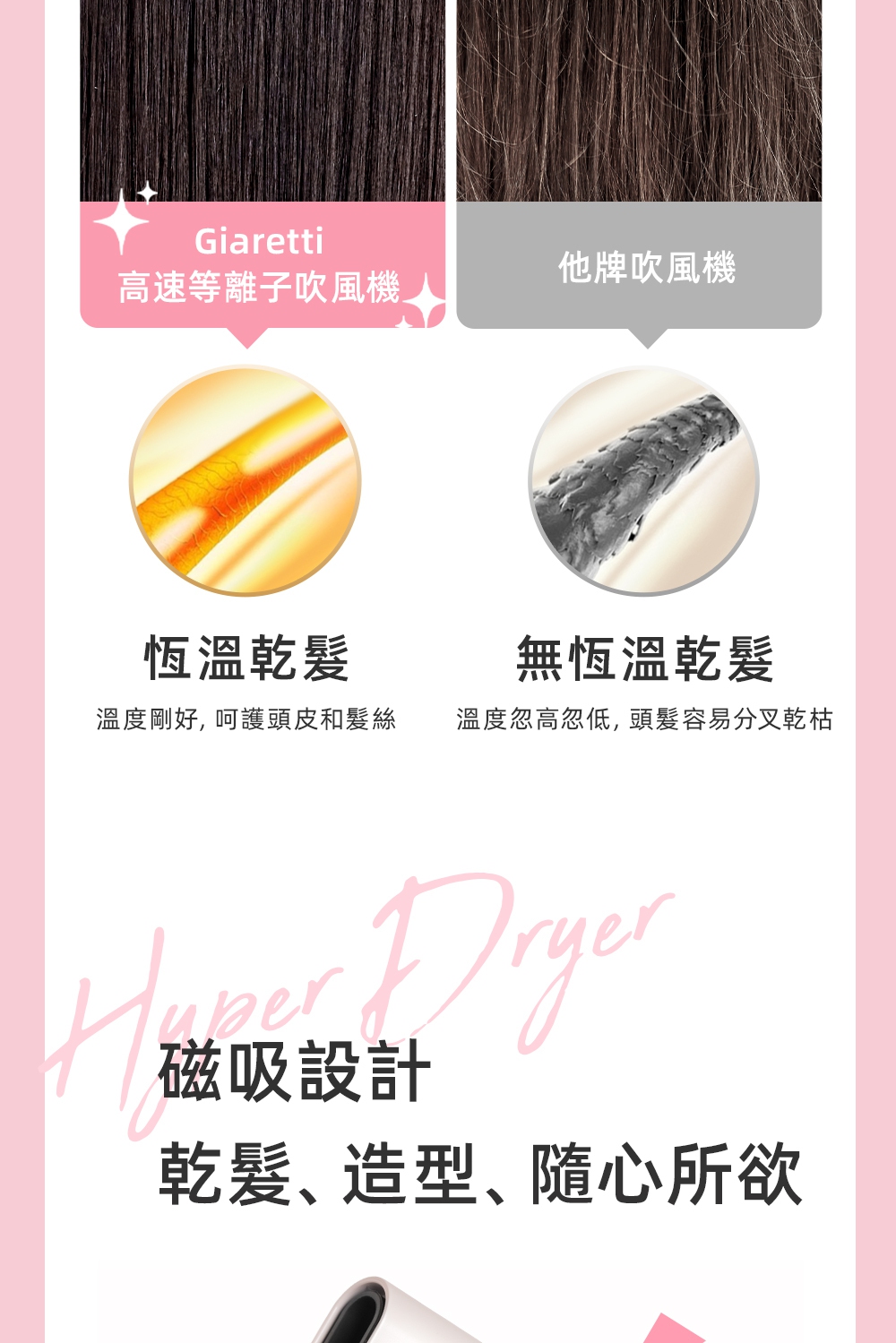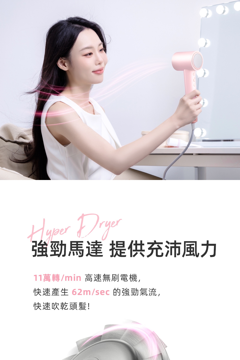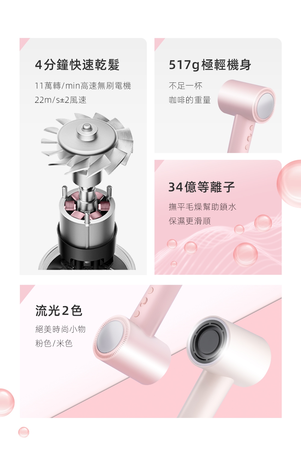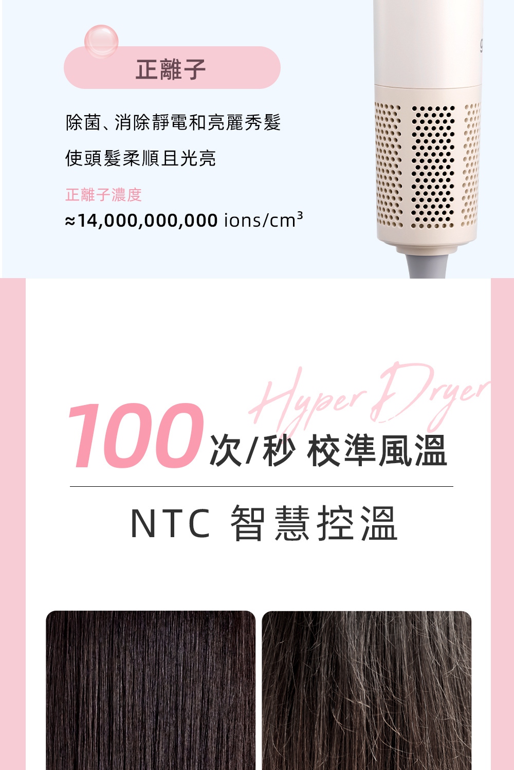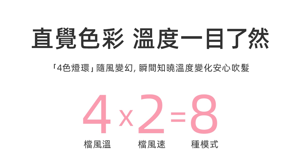 釋放34億等離子-保濕鎖水、撫平毛燥NTC智能冷熱循環風-呵護受損秀髮8種使用模式-貼心打造個性髪型11萬轉BLDC高速馬達-快速乾髮低電磁波輻射-安心使用經典兩色,隨心選擇