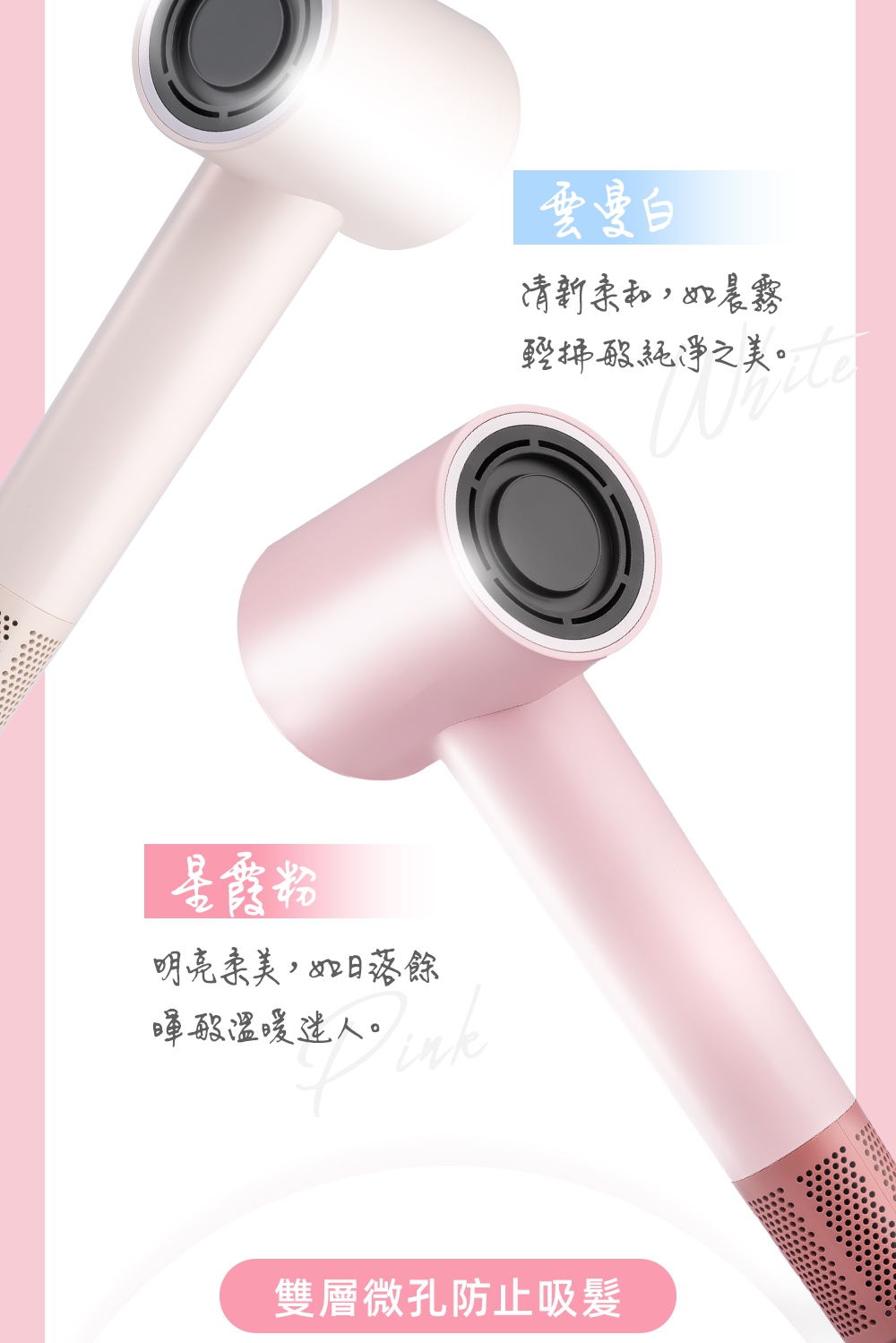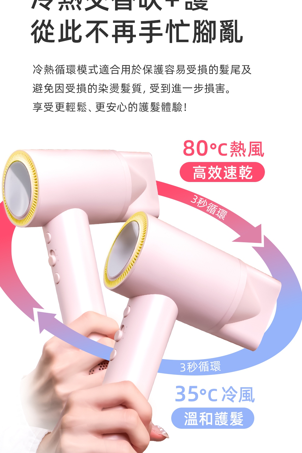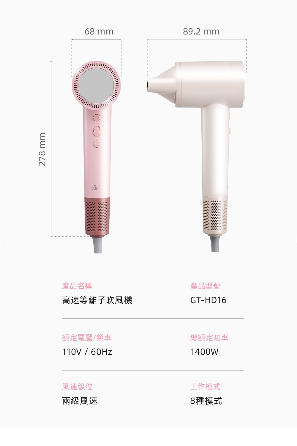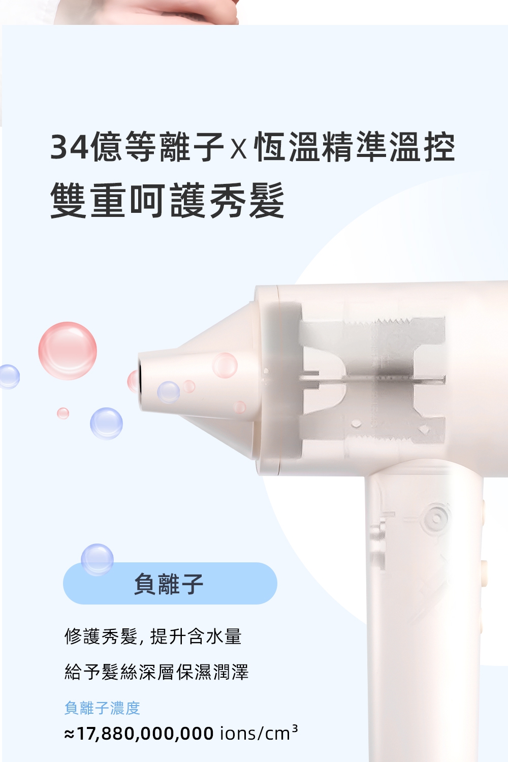 釋放34億等離子-保濕鎖水、撫平毛燥NTC智能冷熱循環風-呵護受損秀髮8種使用模式-貼心打造個性髪型11萬轉BLDC高速馬達-快速乾髮低電磁波輻射-安心使用經典兩色,隨心選擇