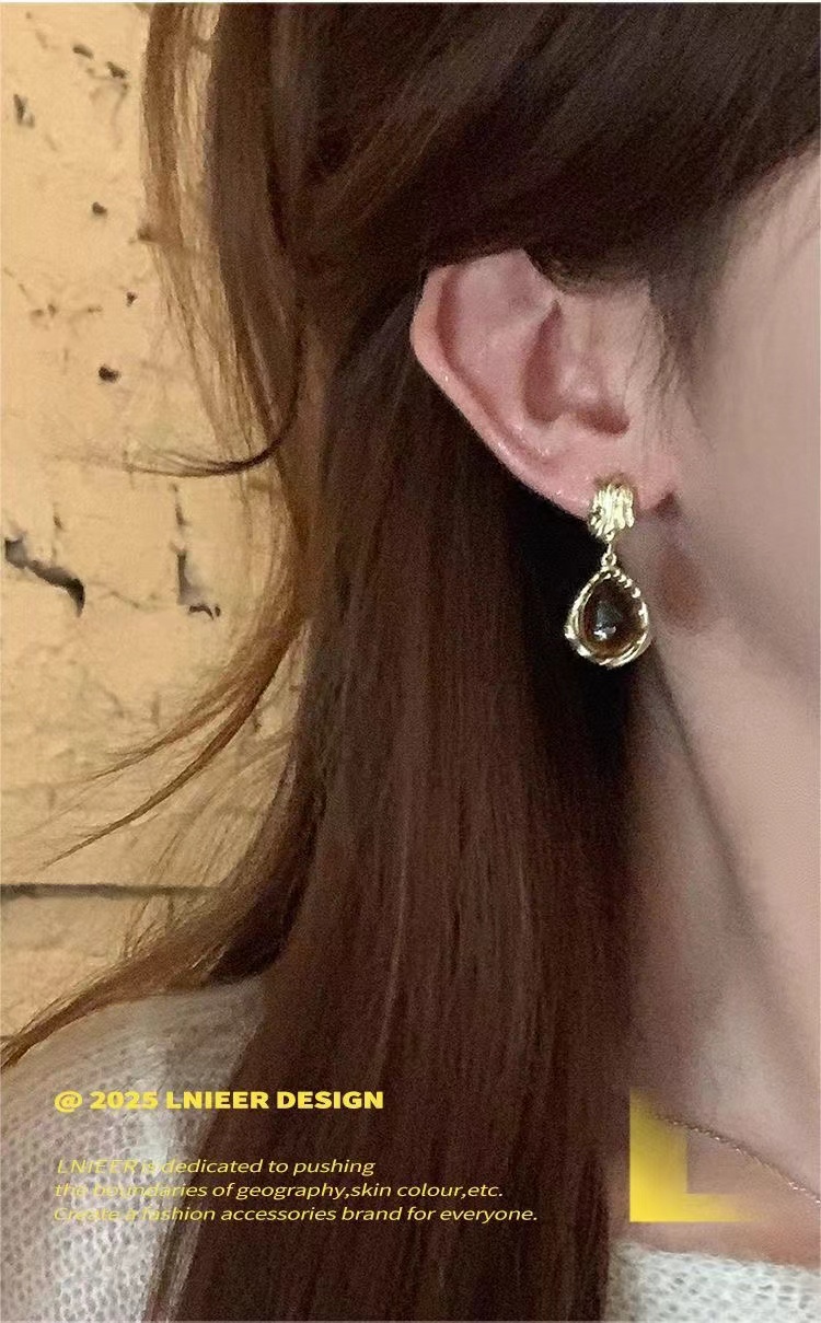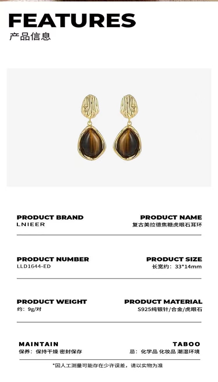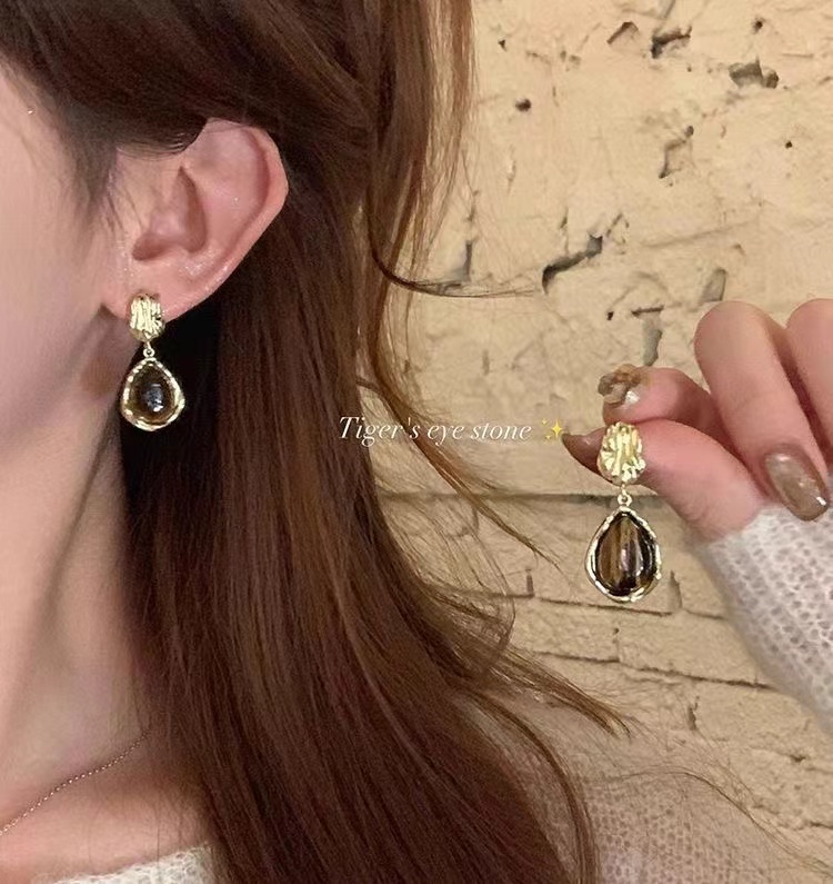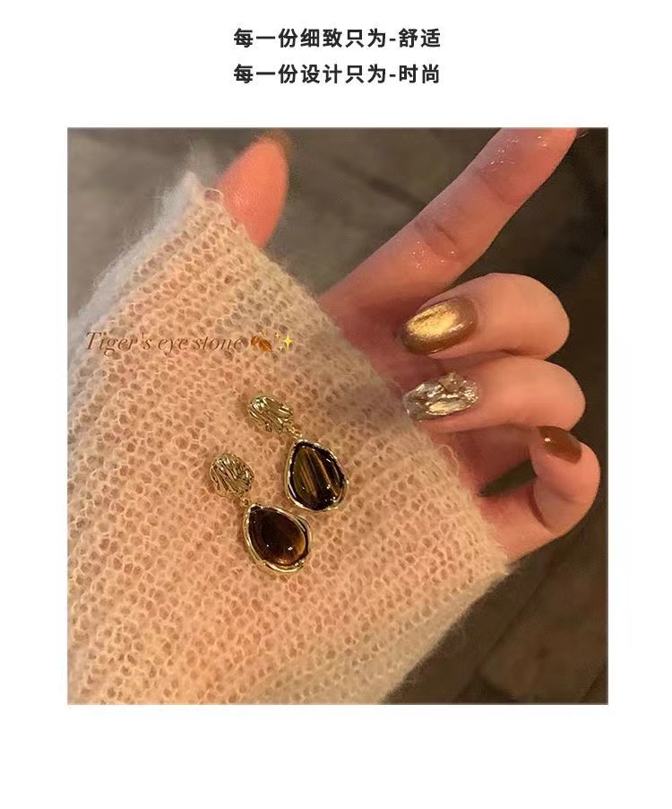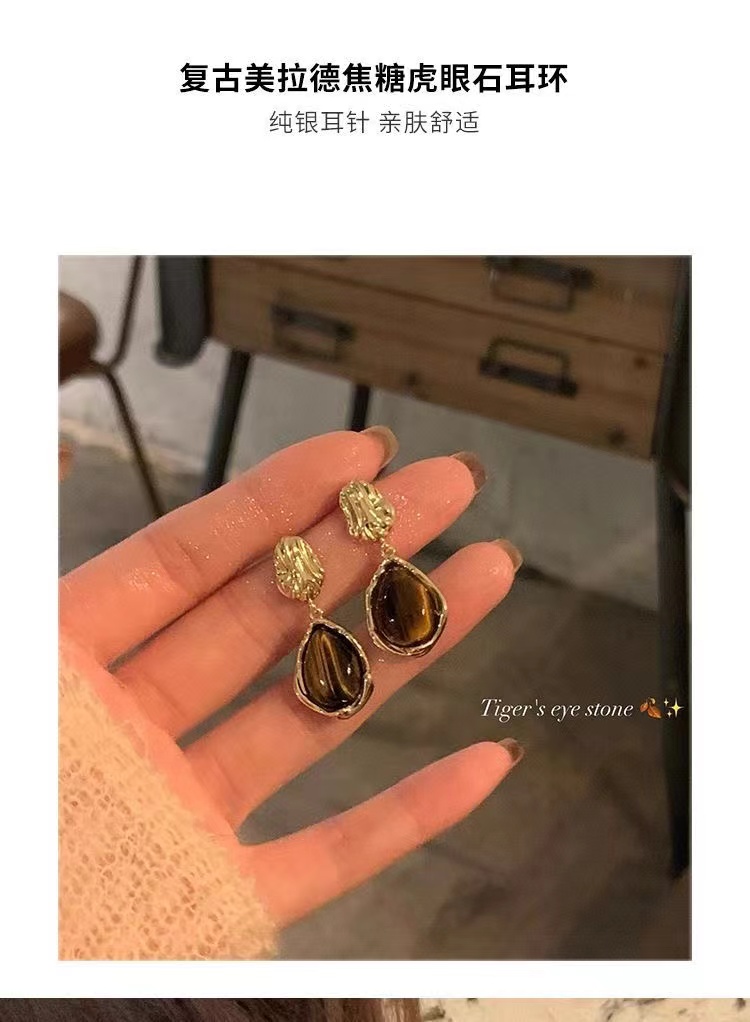 復古美拉德焦糖虎眼石耳環女輕奢小眾氣質耳釘獨特漂亮耳飾